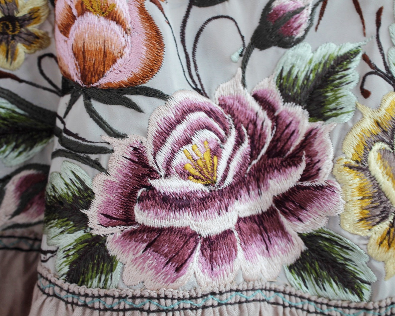 Blusa con bordado tradicional de hilos de colores que forman hermosas flores de colores y hojas que enmarcan el cuello de la prenda uniones a mano mangas tipo globo y tela color beige muy fresca ideal para los días calurosos.