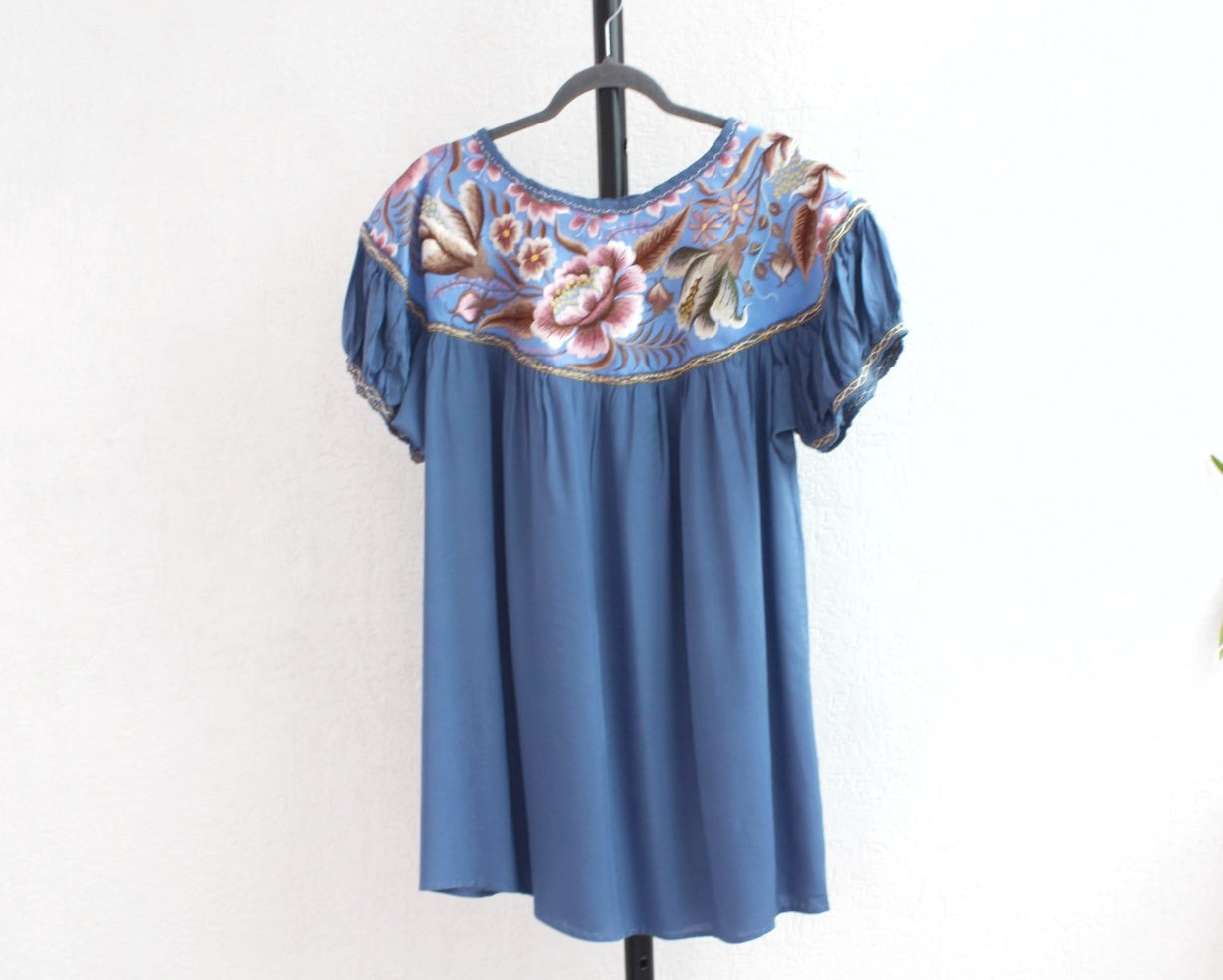 Blusa con bordado tradicional de hilos de colores que forman hermosas flores y hojas que enmarcan el cuello de la prenda, uniones a mano mangas tipo globo y tela color azul petróleo muy fresca ideal para los días calurosos.