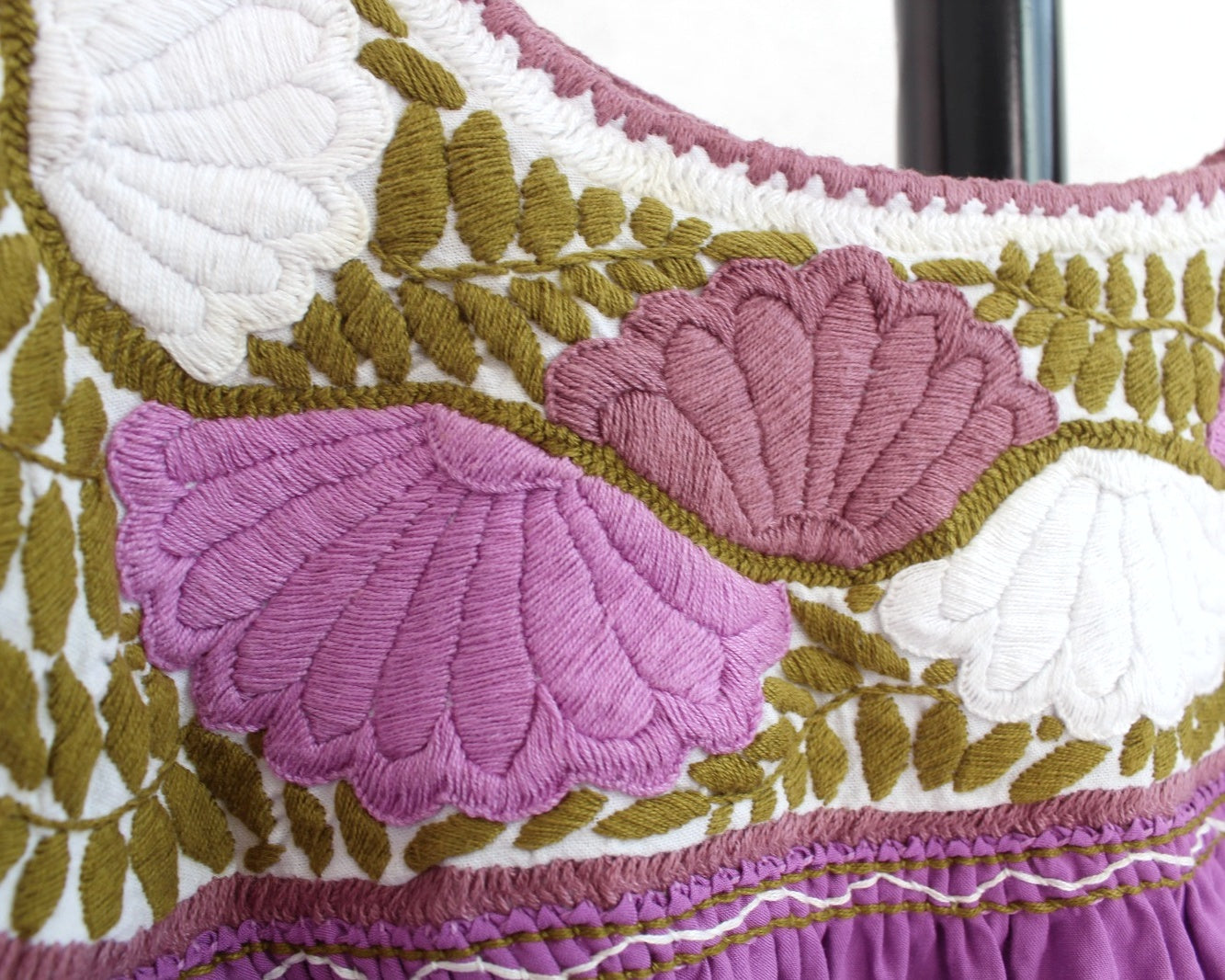 Blusa tradicional región de Aguacatenango con hermoso bordado a mano con hilos de color lila, verde y roa sobre un lienzo blanco que representa hermosas flores, hojas y delicados detalles en el cuello por el frente y la espalda, uniones a mano mangas tipo globo y tela color lila muy fresca ideal para los días calurosos.