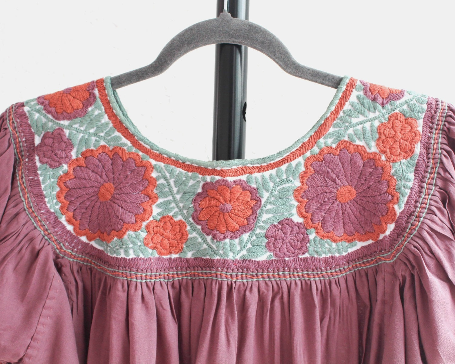 Blusa tradicional región de Aguacatenango con hermoso bordado a mano con hilos de color marsala, naranja y menta sobre un lienzo color blanco que representa hermosas flores, hojas y delicados detalles en el cuello por el frente y la espalda, uniones a mano mangas tipo globo y tela color marsala muy fresca ideal para los días calurosos.