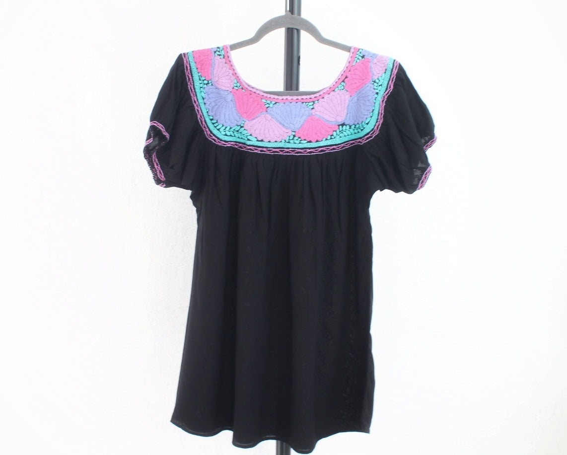Blusa tradicional con hermoso bordado que representa hermosas flores en el cuello de colores rosa, lila y Turquesa sobre un fondo negro por el frente y la espalda, uniones a mano mangas tipo globo y tela color negro muy fresca.