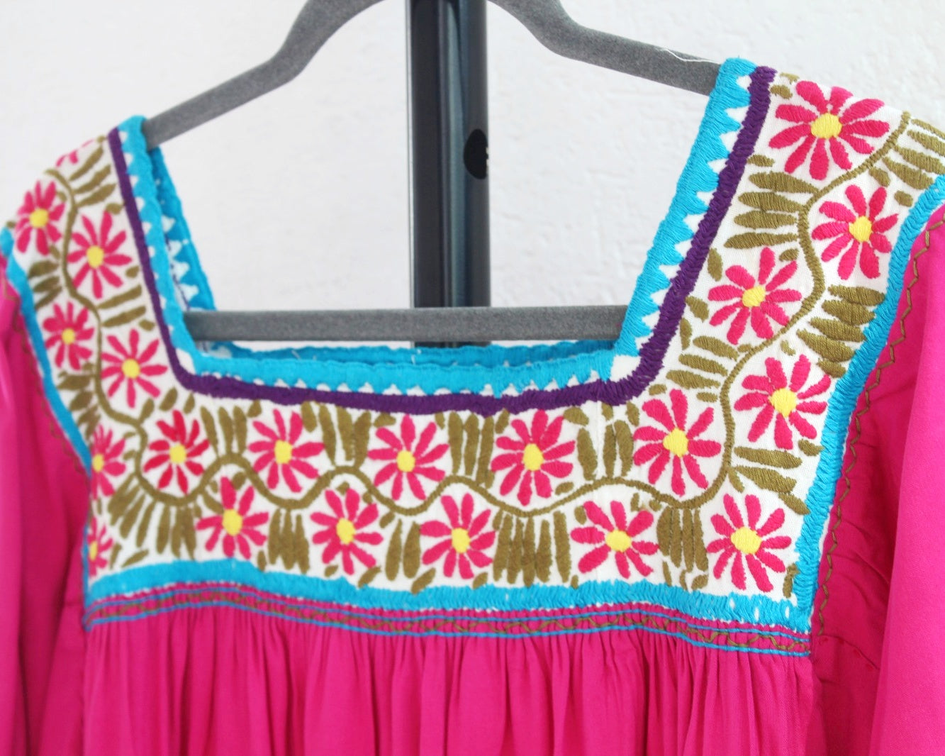 Blusa tradicional región de Aguacatenango con hermoso bordado a mano con hilos de color rosa, amarillo, verde y morado sobre un lienzo color blanco que representa hermosas flores, hojas y delicados detalles en el cuello por el frente y la espalda, uniones a mano mangas 3 /4 tipo globo y tela color rosa mexicano.