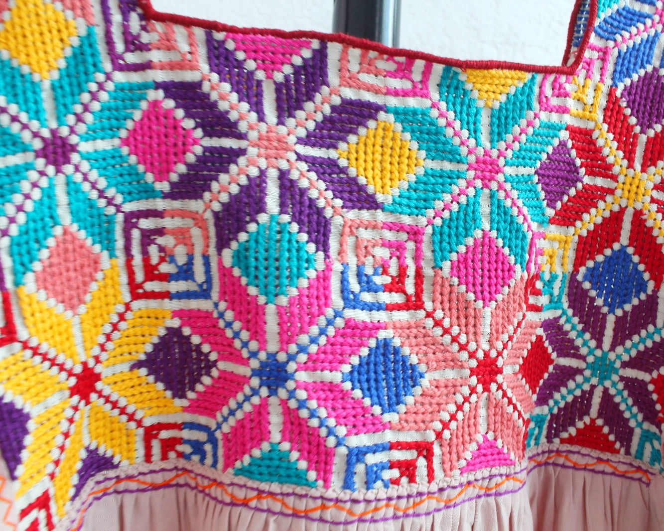 Hermosa blusa con cuello cuadrado con detalle la pechera bordada en técnica de punto de cruz elaborado mano por mujeres artesanas mexicanas de la región de Chiapas, el bordado representa hermosos rombos de colores que forman lindas flores de colores, mangas 3/4, cordón en los puños de las mangas, tela color beige.