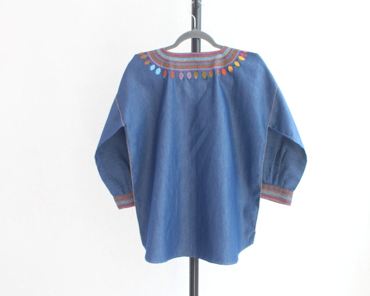 Hermosa blusa tradicional de corte recto con bordado a mano en esta hermosa técnica artesanal de rococo con hilos de colores que hacen destacar el cuello con lindas flores de hilos de colores sobre un fondo de mezclilla.