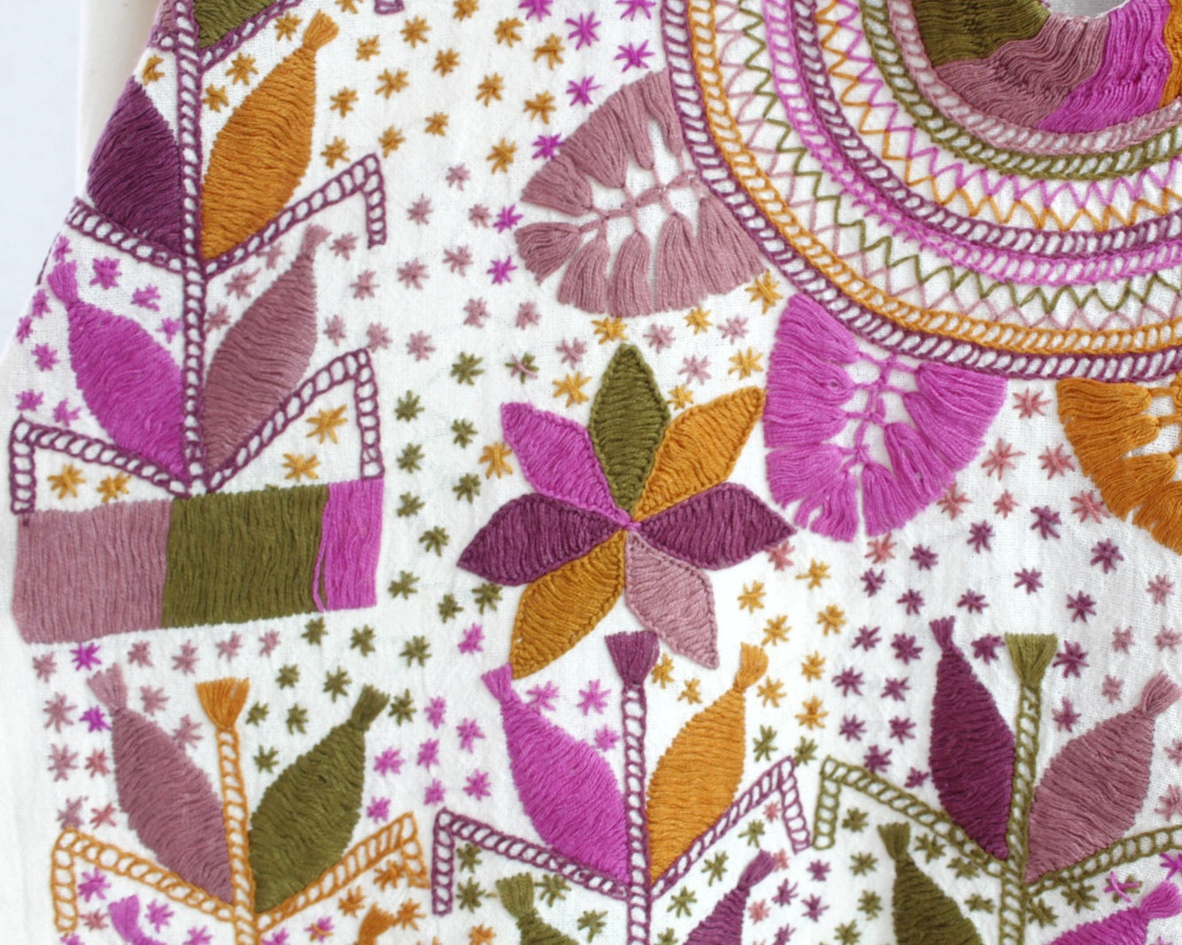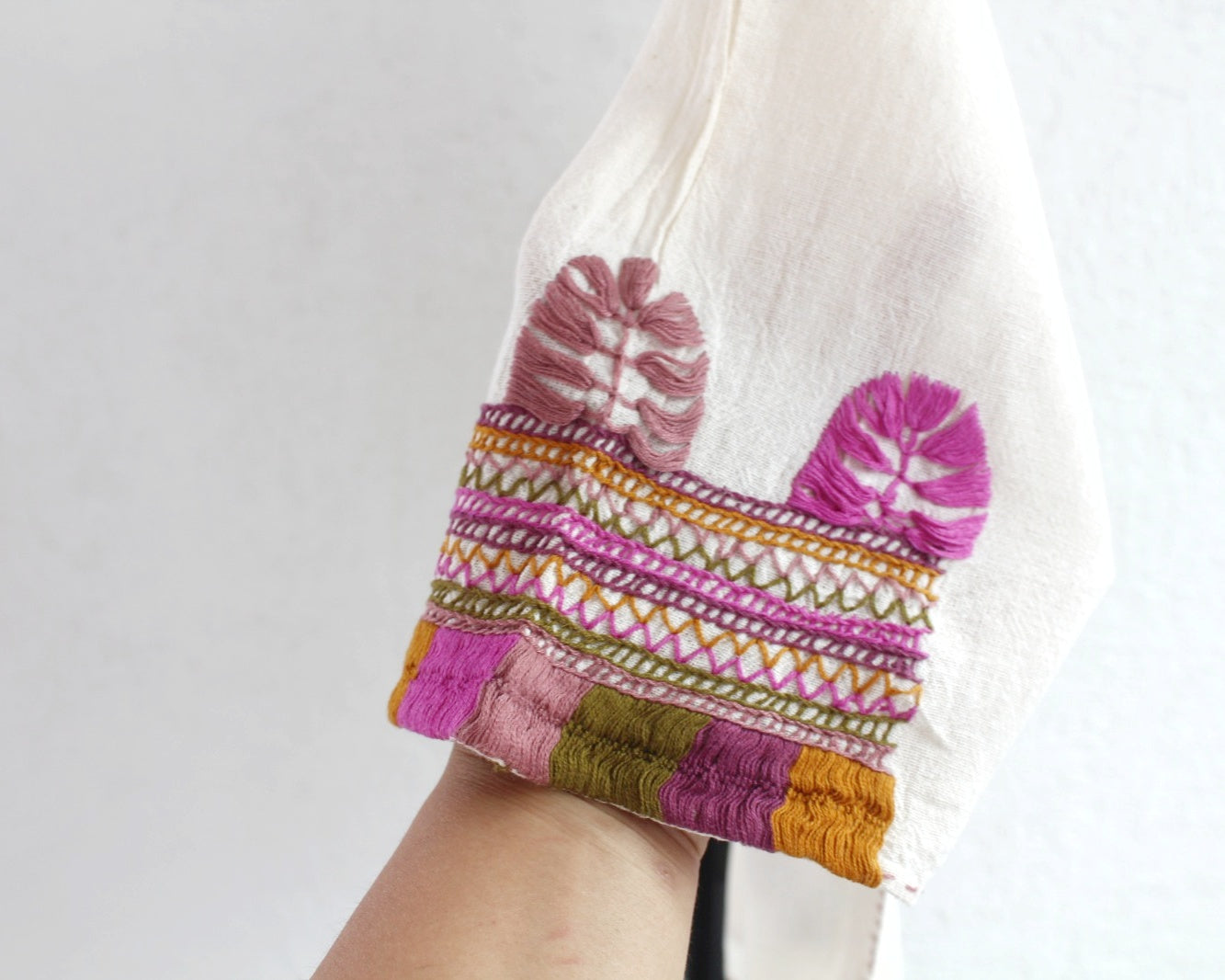 Blusa bordada a mano que dibujan una milpa, florecitas y estrellas de color palod e rosa, rosa verde, vino y amarillo sobre un lienzo de tela color manta natural, uniones a mano y manga 3/4 con detalla en la orilla