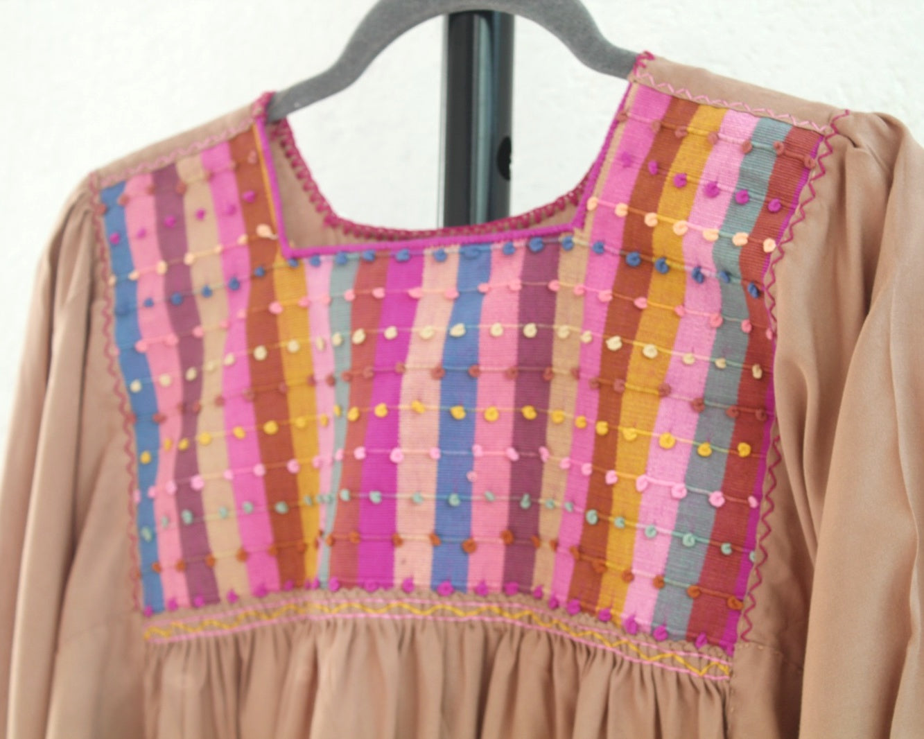 Blusa con detalle de nuditos en el cuello por el frente que se elabora en telar de cintura y uniones a mano mangas 3/4 y tela muy fresca ideal para los días calurosos color beige.