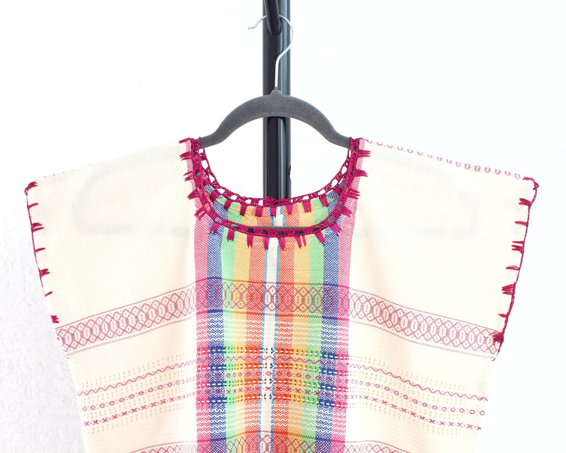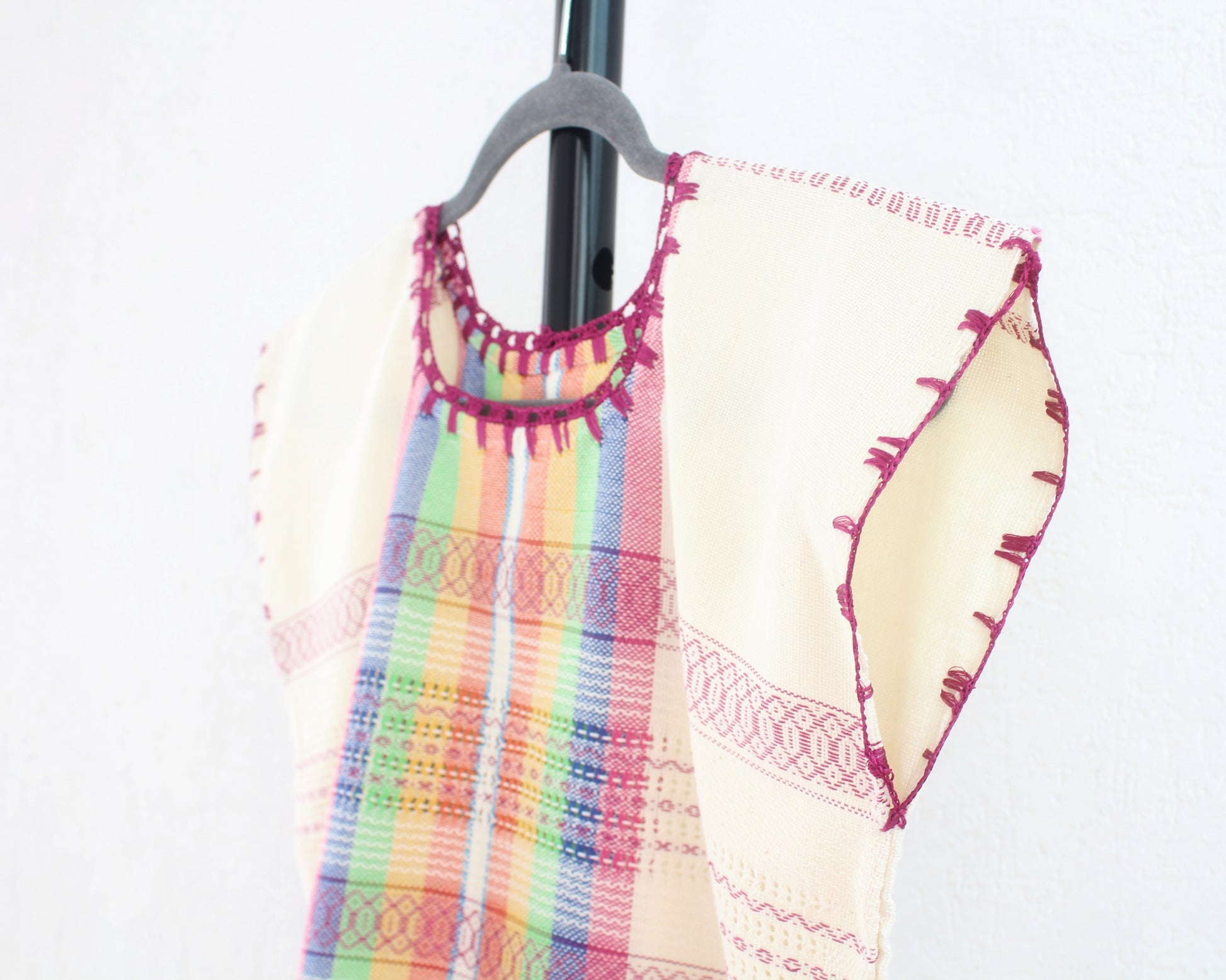 Hermosa blusa tipo top elaborada en técnica artesanal de telar de pedal que con hilos de colores dibujan lindos detalles al frente lienzo de color natural, colores el contorno se destaca una linda puntada color rosa tejida por artesanas mexicanas de la región de Oaxaca