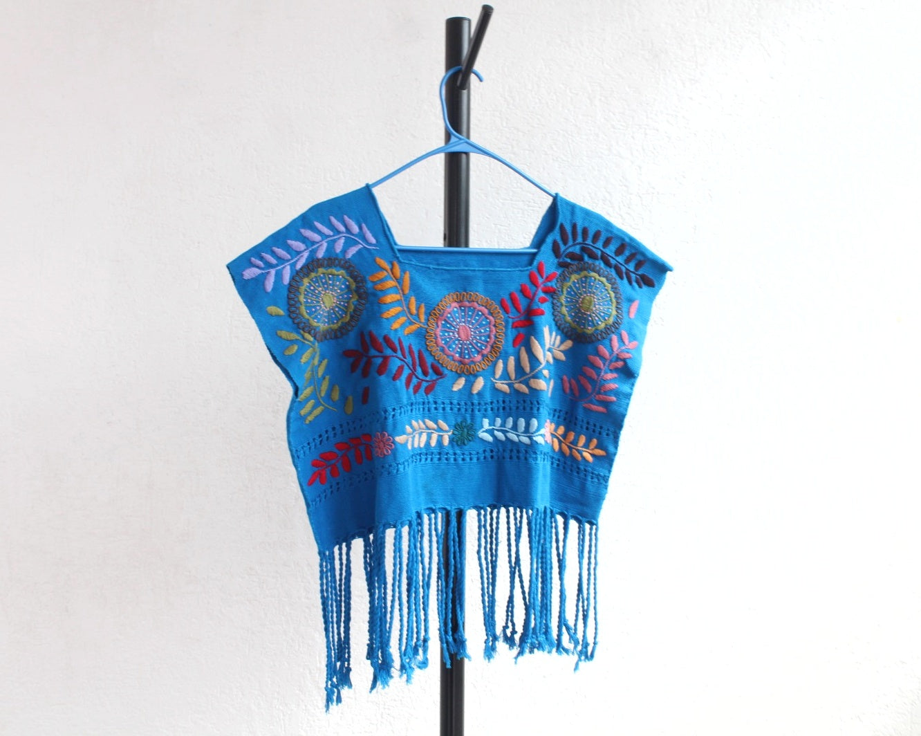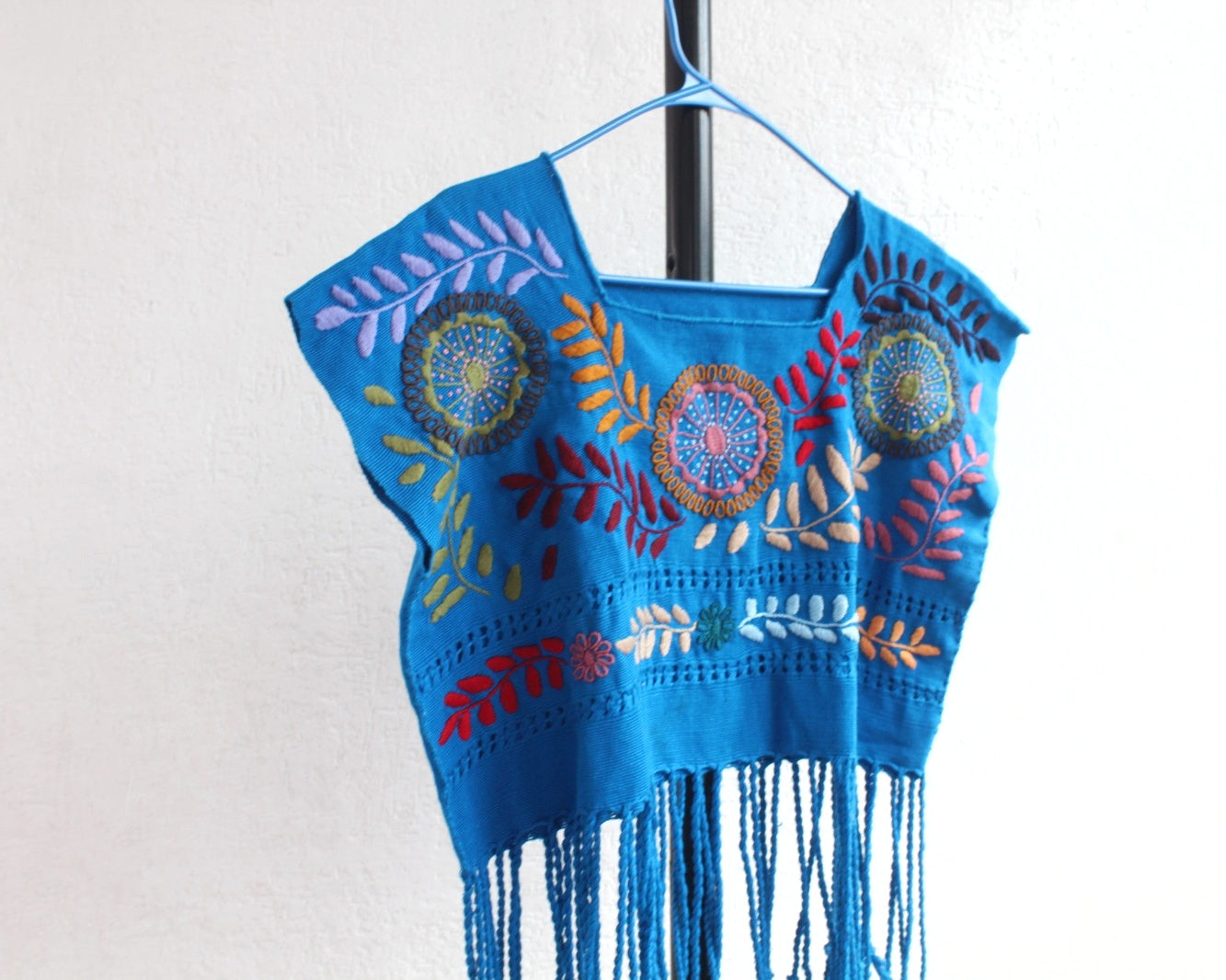 Hermoso detalle con lindas flores y hojas que destacan sobre un lienzo con líneas verticales de colores azul celeste que hacen una blusa única muy linda