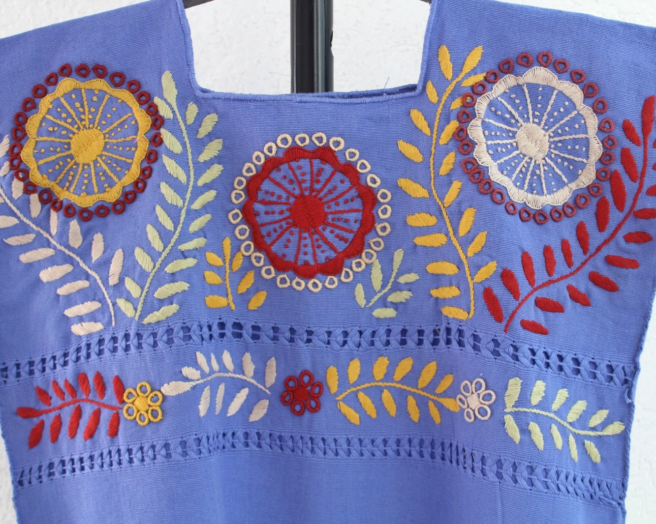 Hermoso detalle al frente de hermoso bordado a mano en técnica de Rococo con hilos de colores que dibujan hermosas flores, la blusa está tejida en telar de cintura color lila hacen una blusa única muy linda