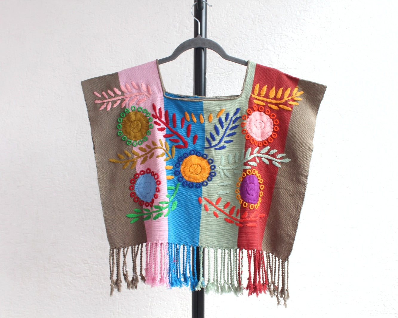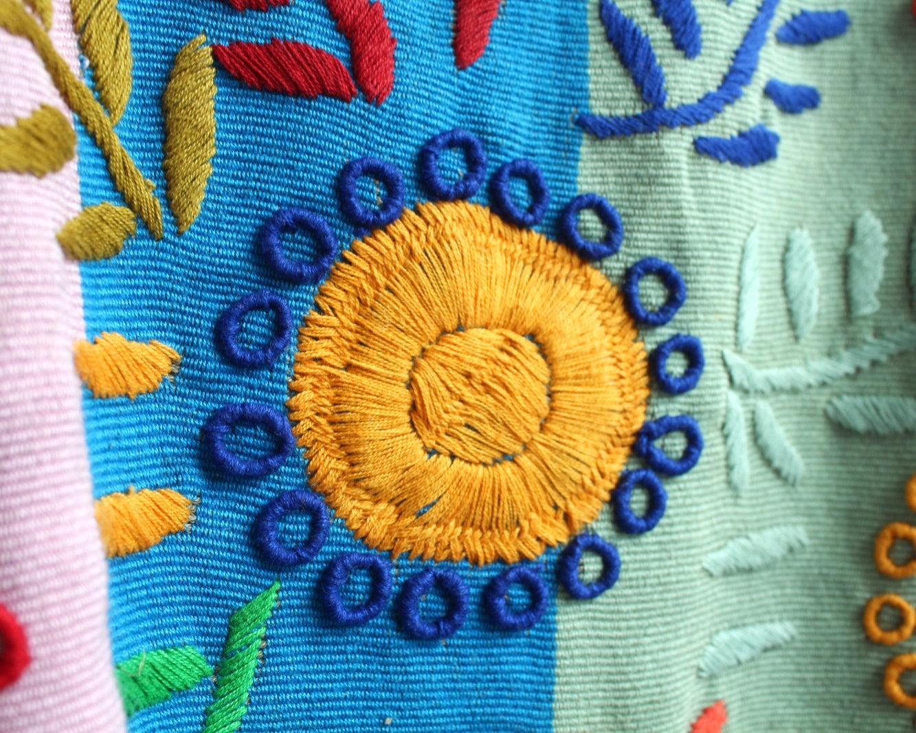 Hermoso detalle con lindas flores y hojas que destacan sobre un lienzo con líneas verticales de colores verde olivo, rosa, menta, azul y rojo que hacen una blusa única muy linda