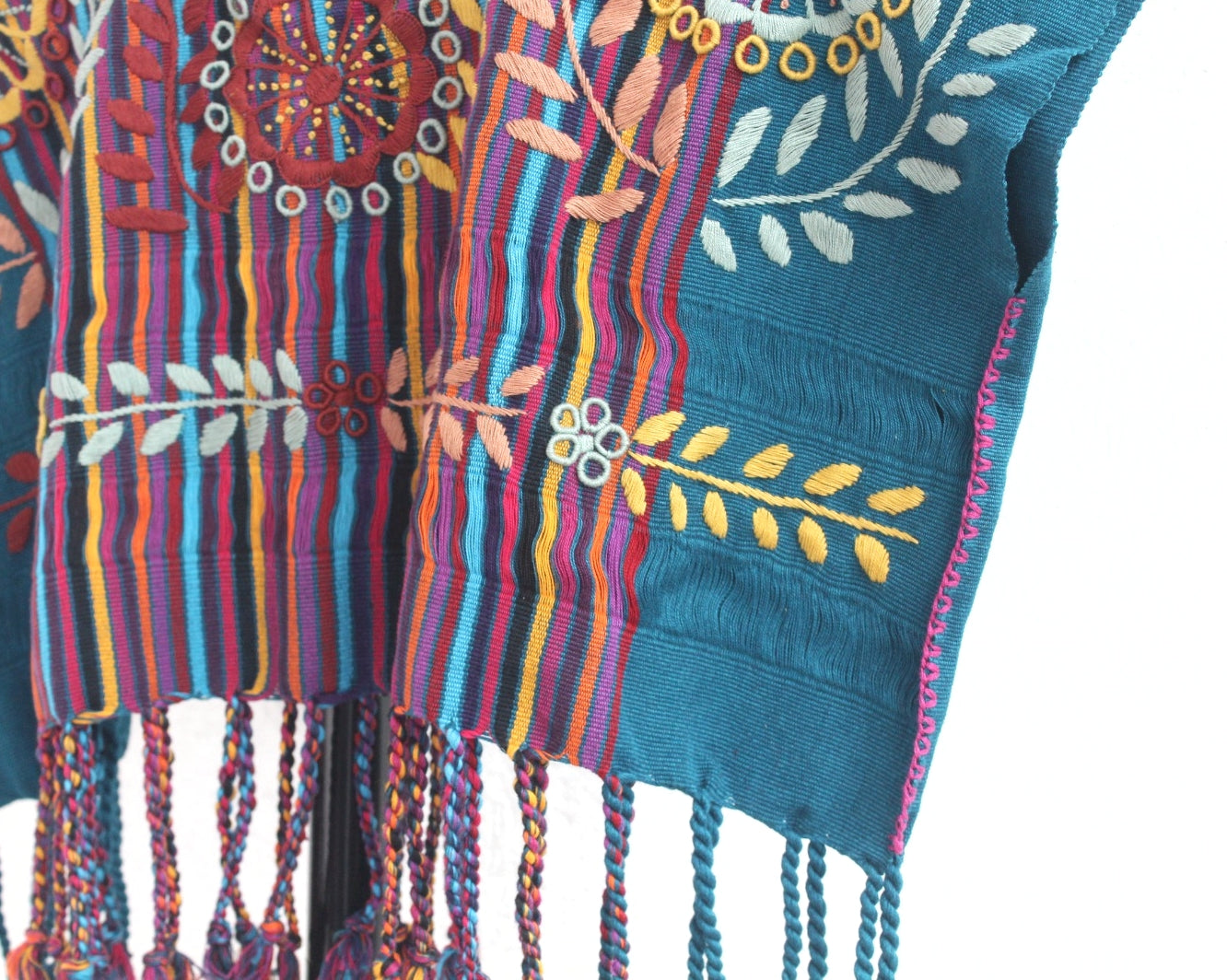 Hermoso detalle con lindas flores y hojas que destacan sobre un lienzo con líneas verticales de colores, rosa, rojo, amarillo, azul, verde lila y naranja a los costados destaca el color verde Azulado que hacen una blusa única muy linda
