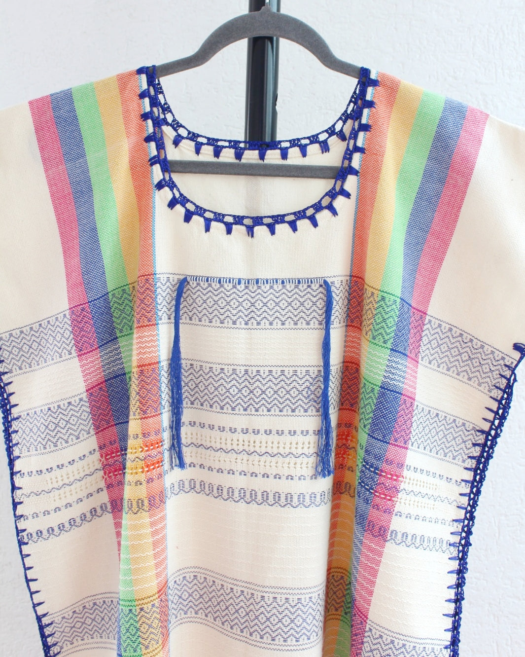 Hermoso huipil tejido en telar de pedal con hilos de algodón con lineas de colores y detalles tejido en gancho al contorno que resaltan en color azul.