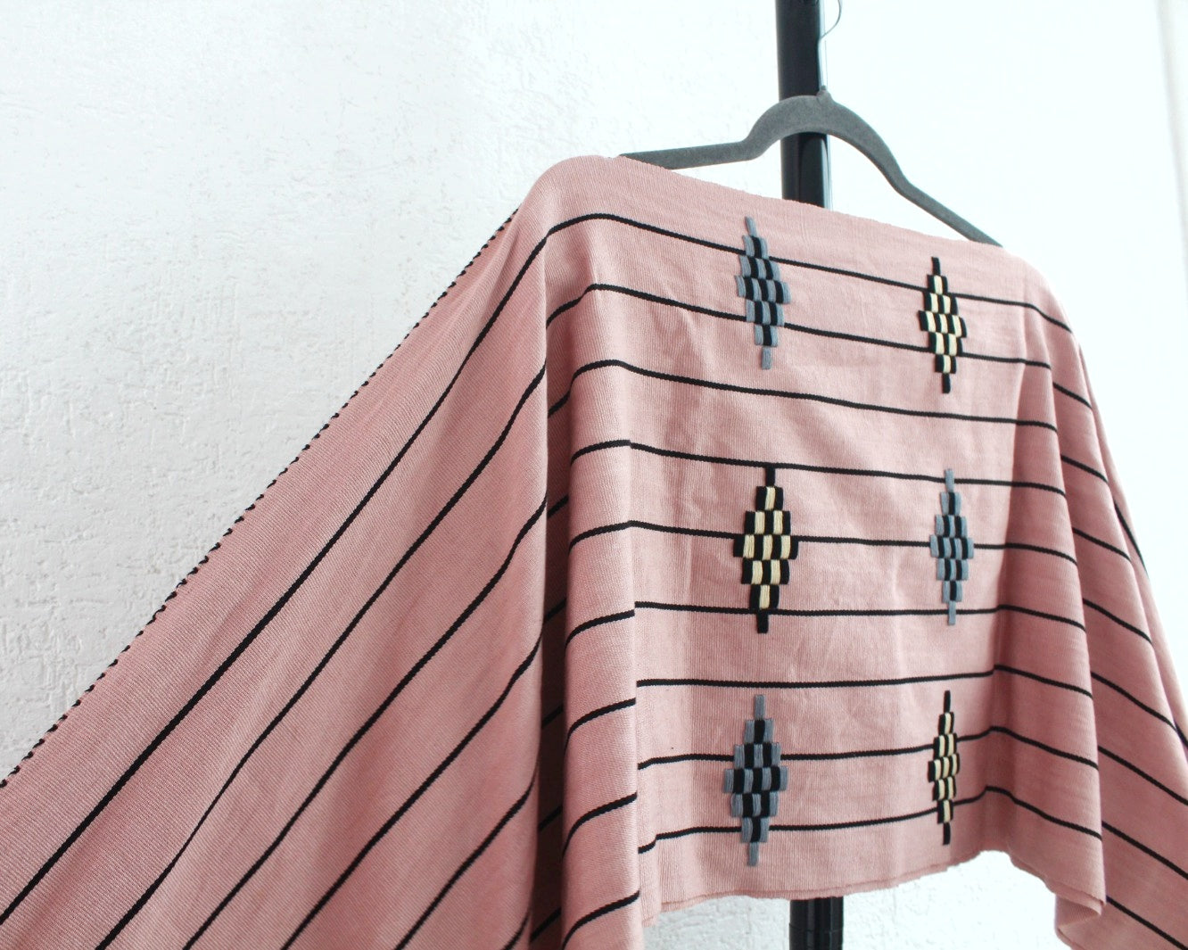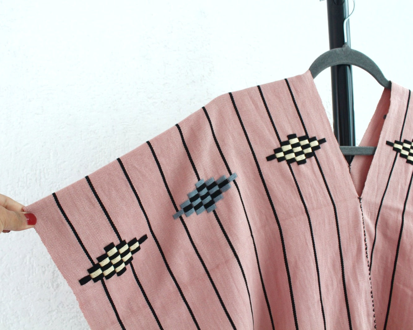 Hermosa combinación de color rosa y líneas negras muy delgadas que logran una prenda única.