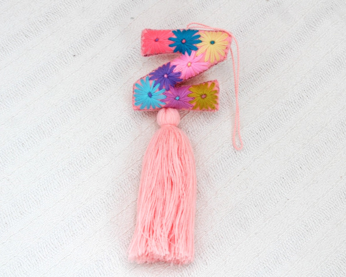 Elaborada a mano con fieltro e hilos de colores con hermosas flores bordadas sobre un fondo color rosa y pompón de color rosa claro.