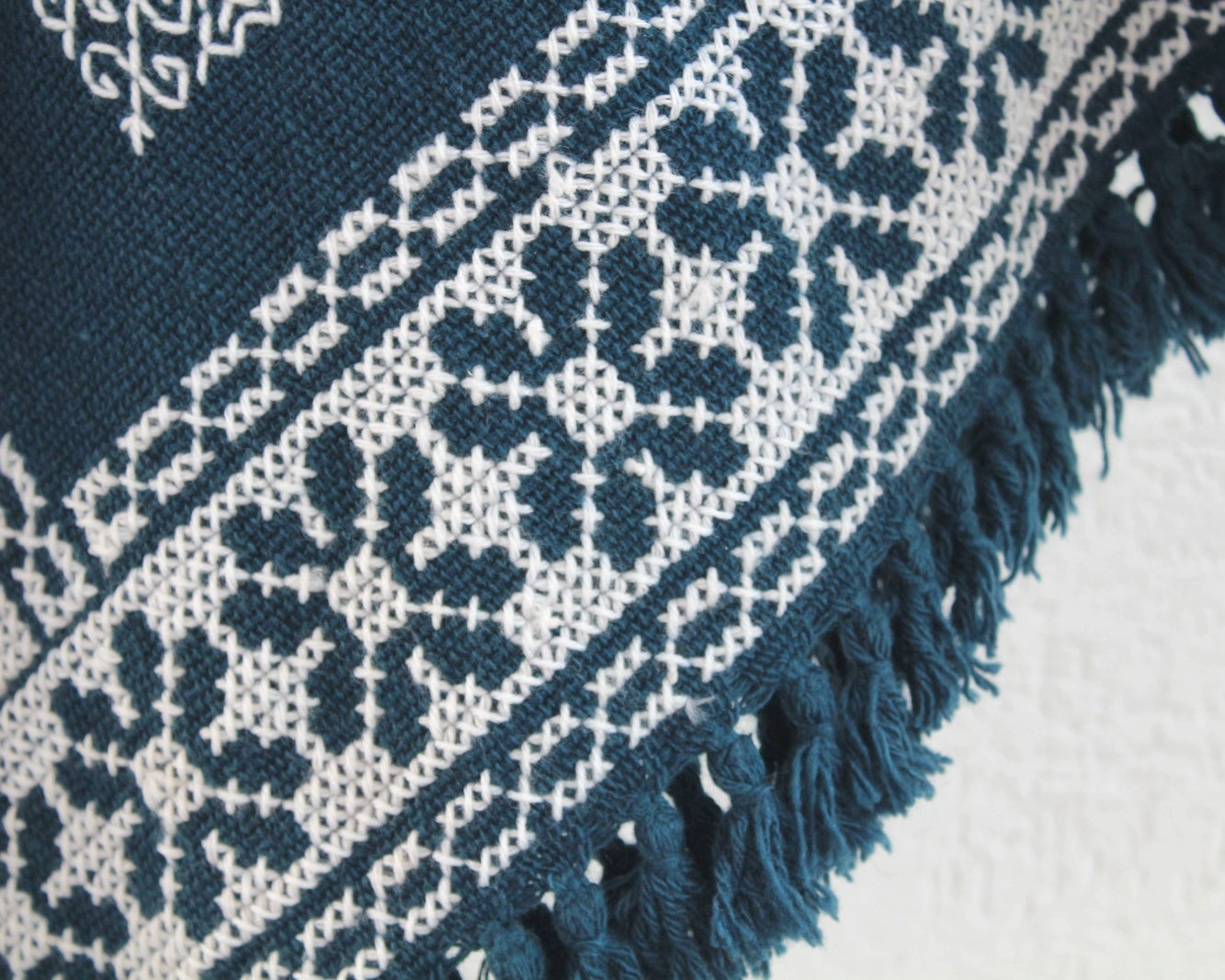 Hermoso Quexquémitl pieza bordado punto de cruz se realiza a mano con hermosos estambres de color blanco sobre un fondo en color rosa logrando una pieza llena de magia y muy elegante