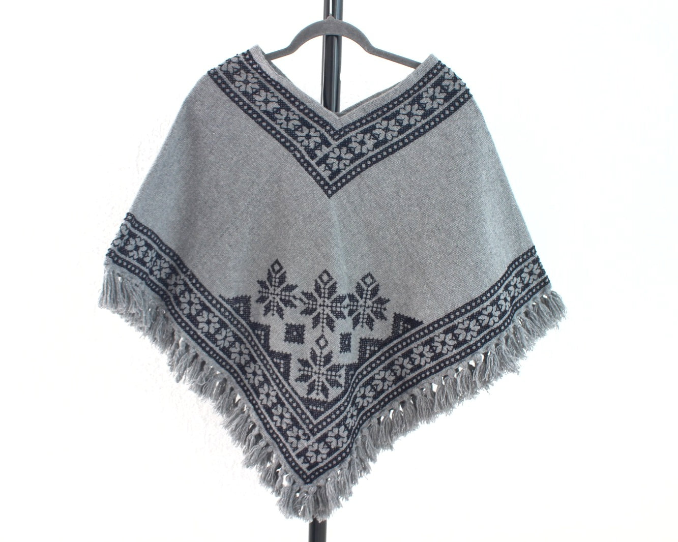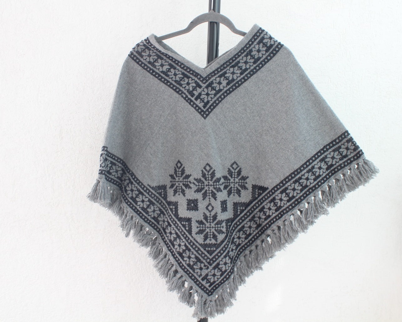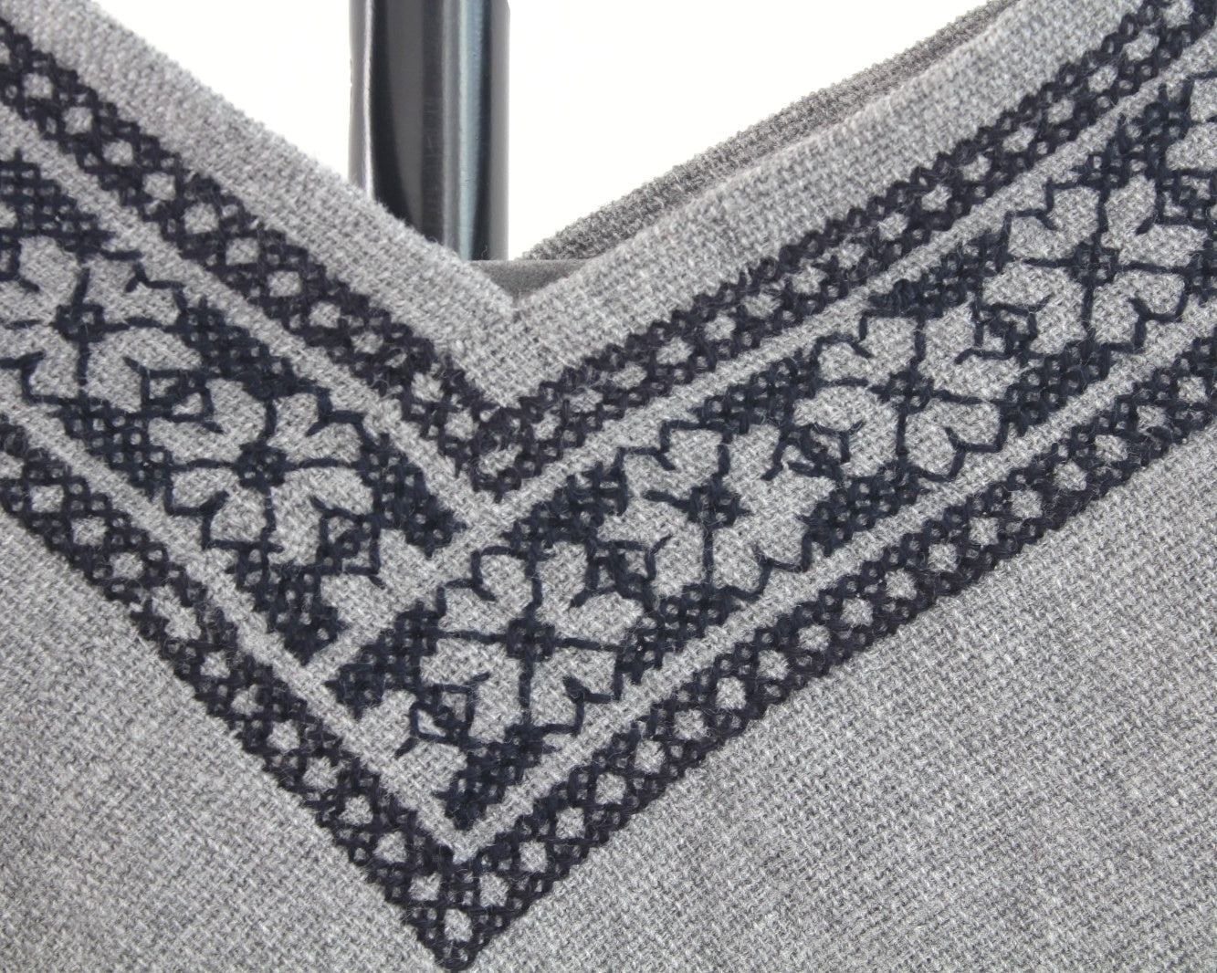 Hermoso Quexquémitl pieza bordado punto de cruz se realiza a mano con hermosos estambres de color negro sobre un fondo en color gris logrando una pieza llena de magia y muy elegante