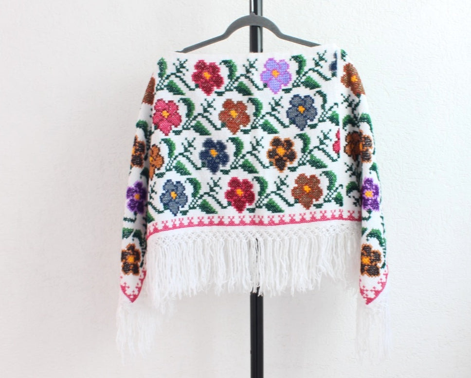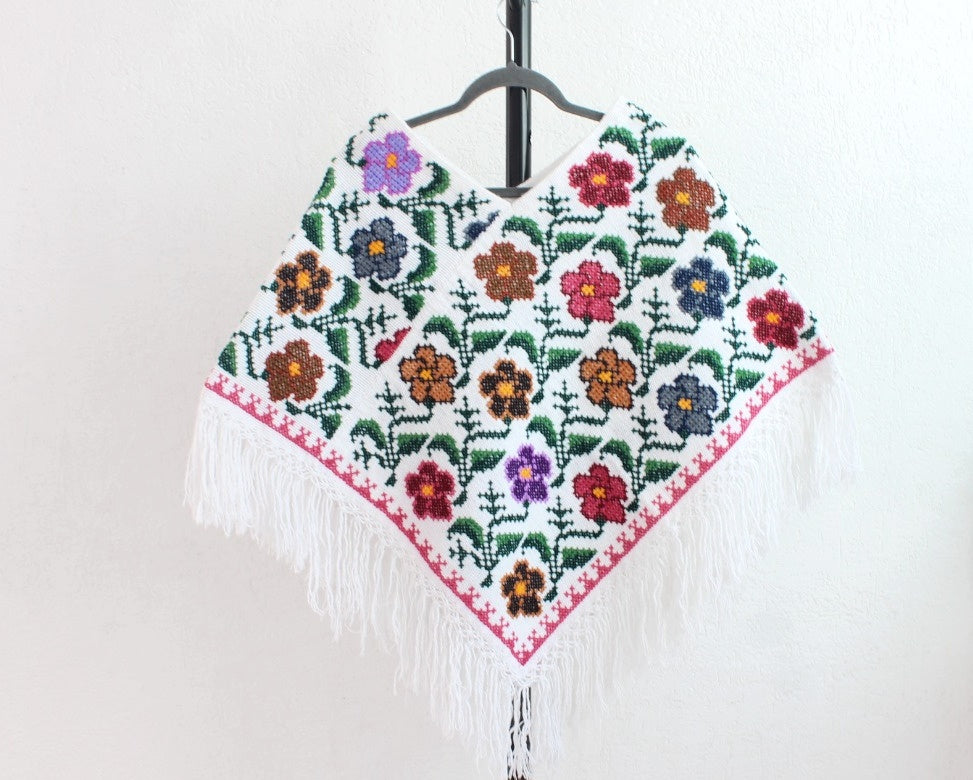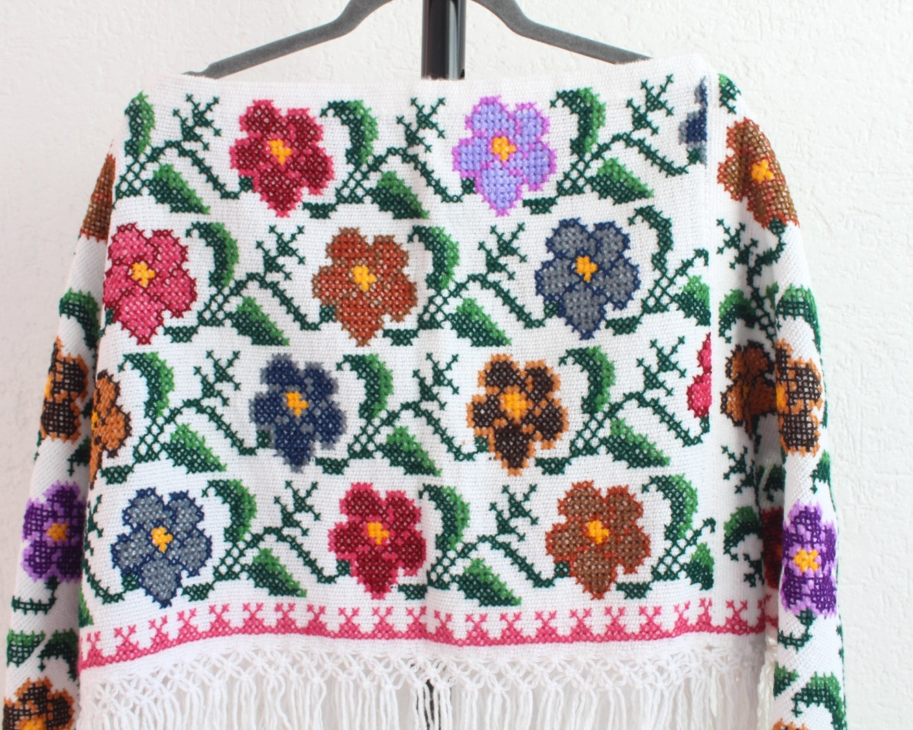Hermoso Quexquémitl pieza bordada a mano hermosas flores en punto de cruz con hermosos estambres de colores sobre un fondo blanco que logran una pieza llena de magia y color