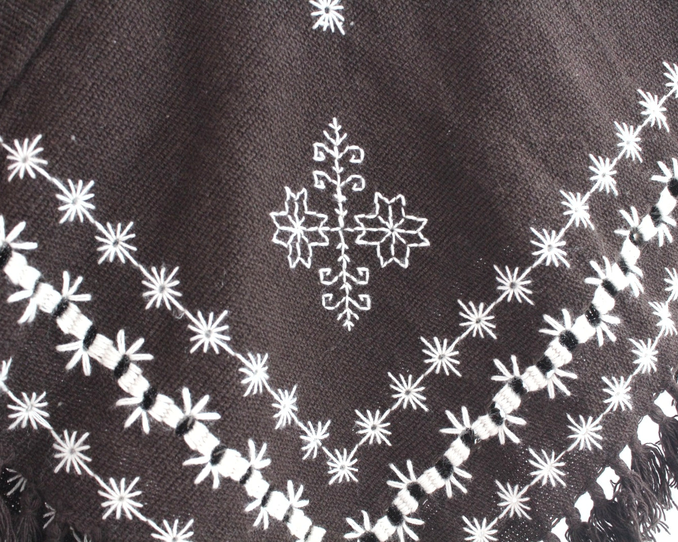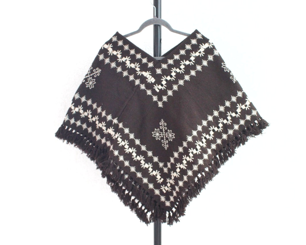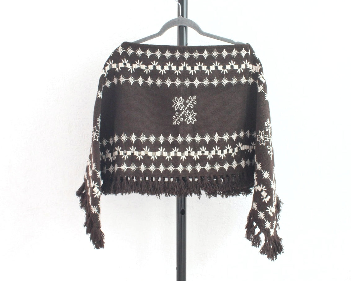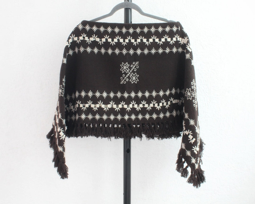 Hermoso Quexquémitl pieza bordado mazahua se realiza a mano con hermosos estambres de color blanco sobre un fondo en tono cafe fuerte, detalle deshilado que dan un toque diferente logrando una pieza llena de magia y muy elegante