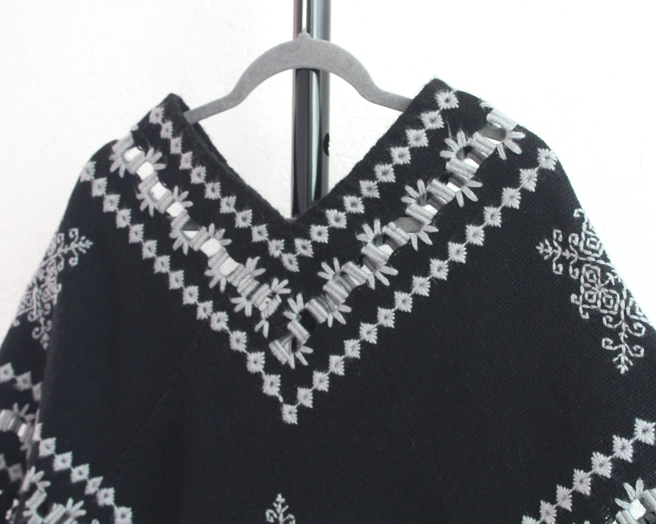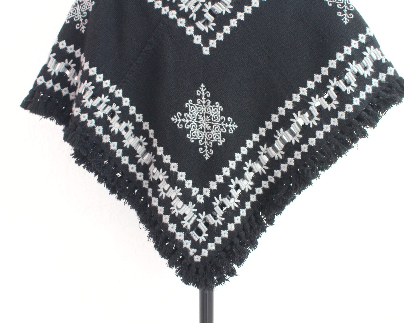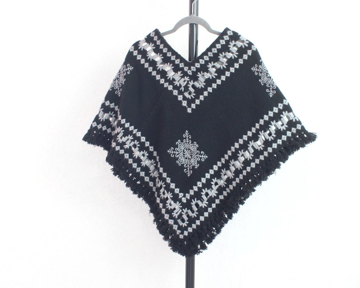 Hermoso Quexquémitl pieza bordado mazahua se realiza a mano con hermosos estambres de color gris claro sobre un fondo color negro, detalle deshilado que dan un toque diferente logrando una pieza llena de magia y muy elegante
