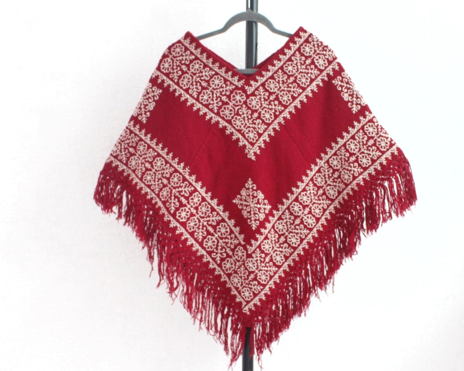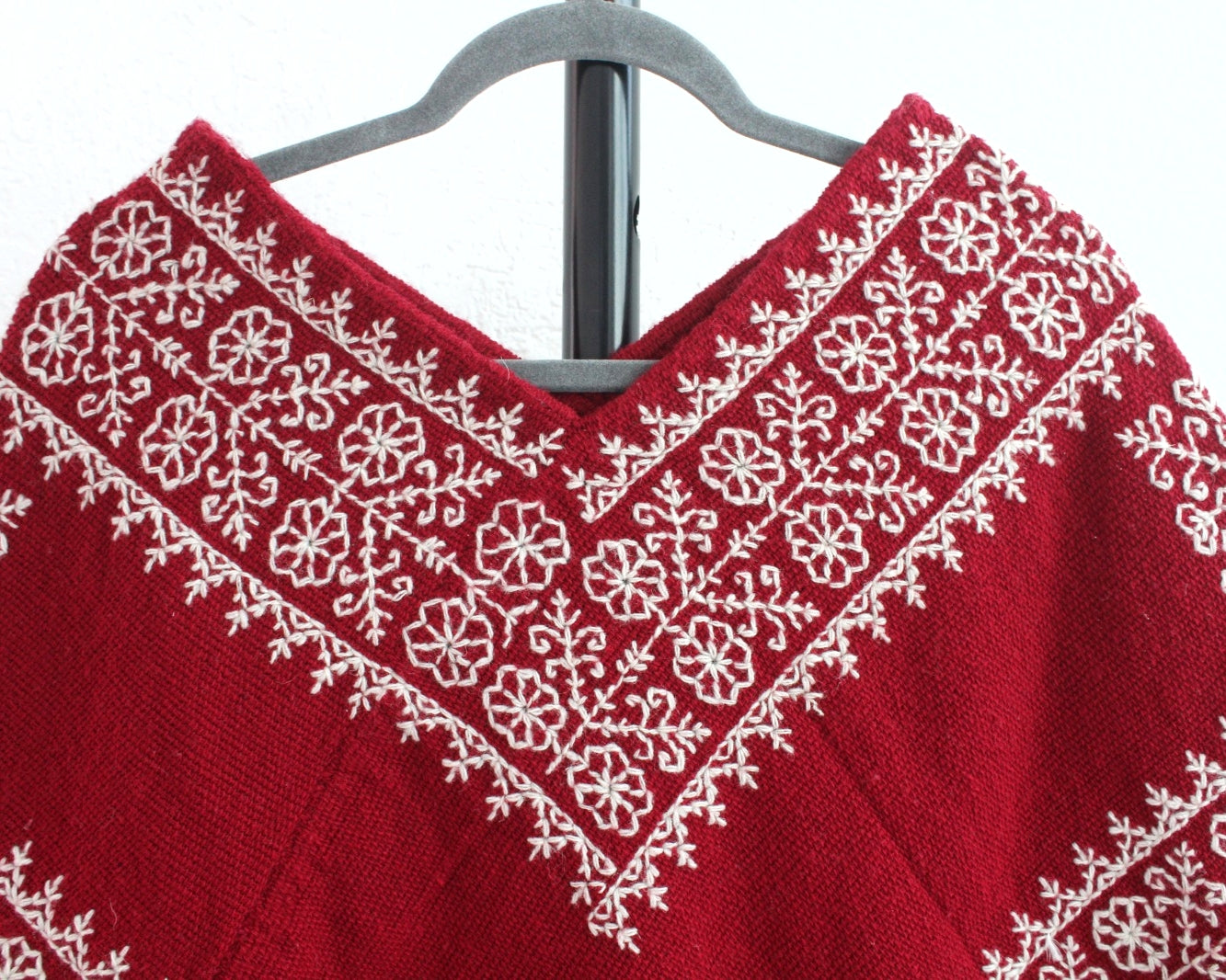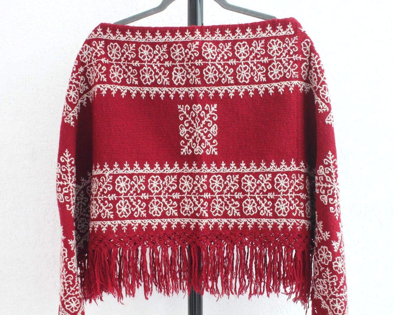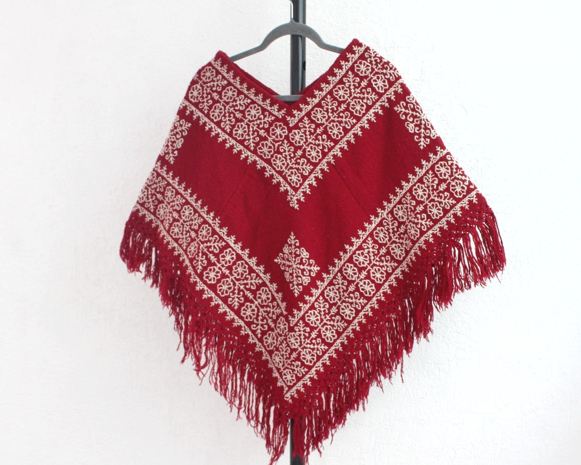 Hermoso Quexquémitl pieza bordado mazahua se realiza a mano con hermosos estambres de color blanco sobre un fondo rojo que logran una pieza muy elegante.