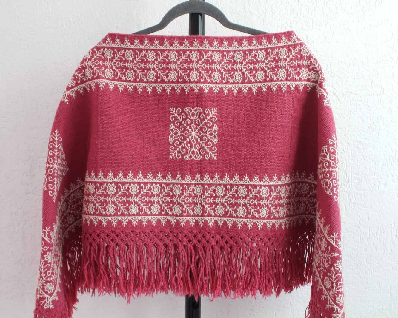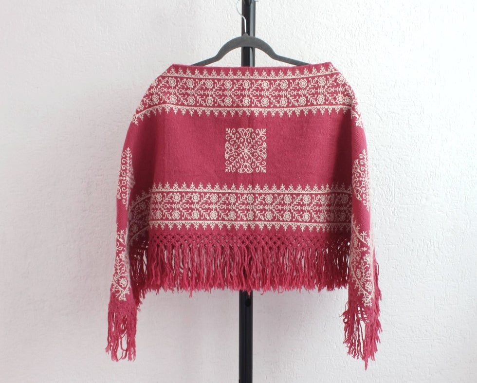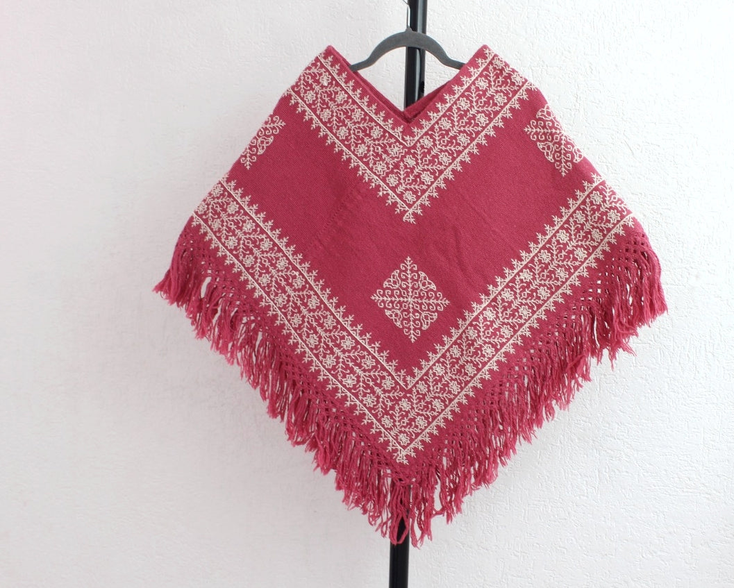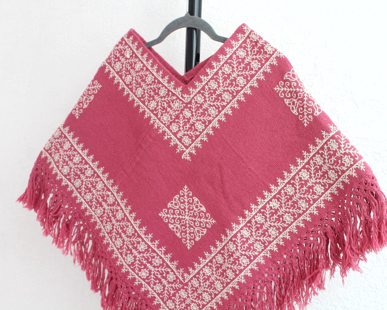 Hermoso Quexquémitl pieza bordado mazahua se realiza a mano con hermosos estambres de color blanco sobre un fondo rosa que logran una pieza muy elegante.