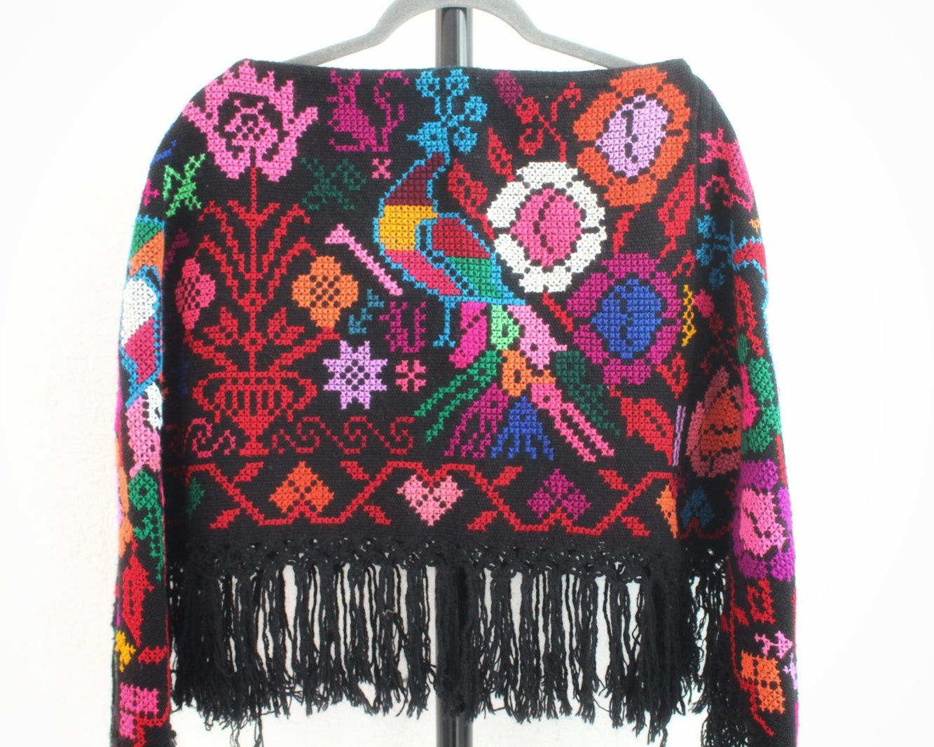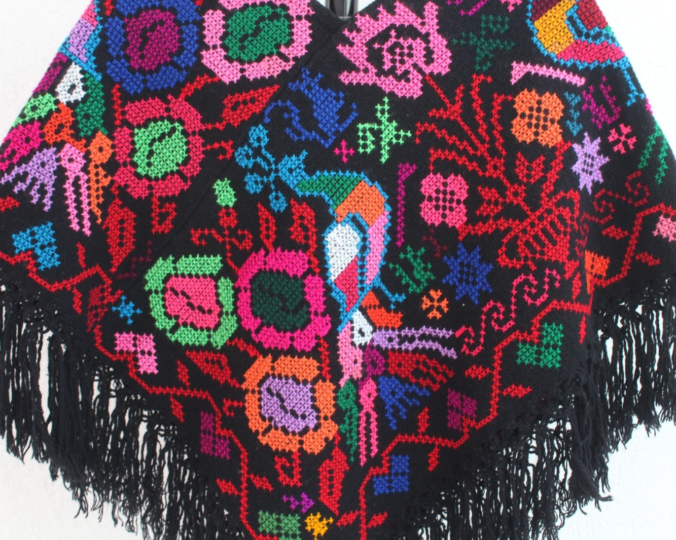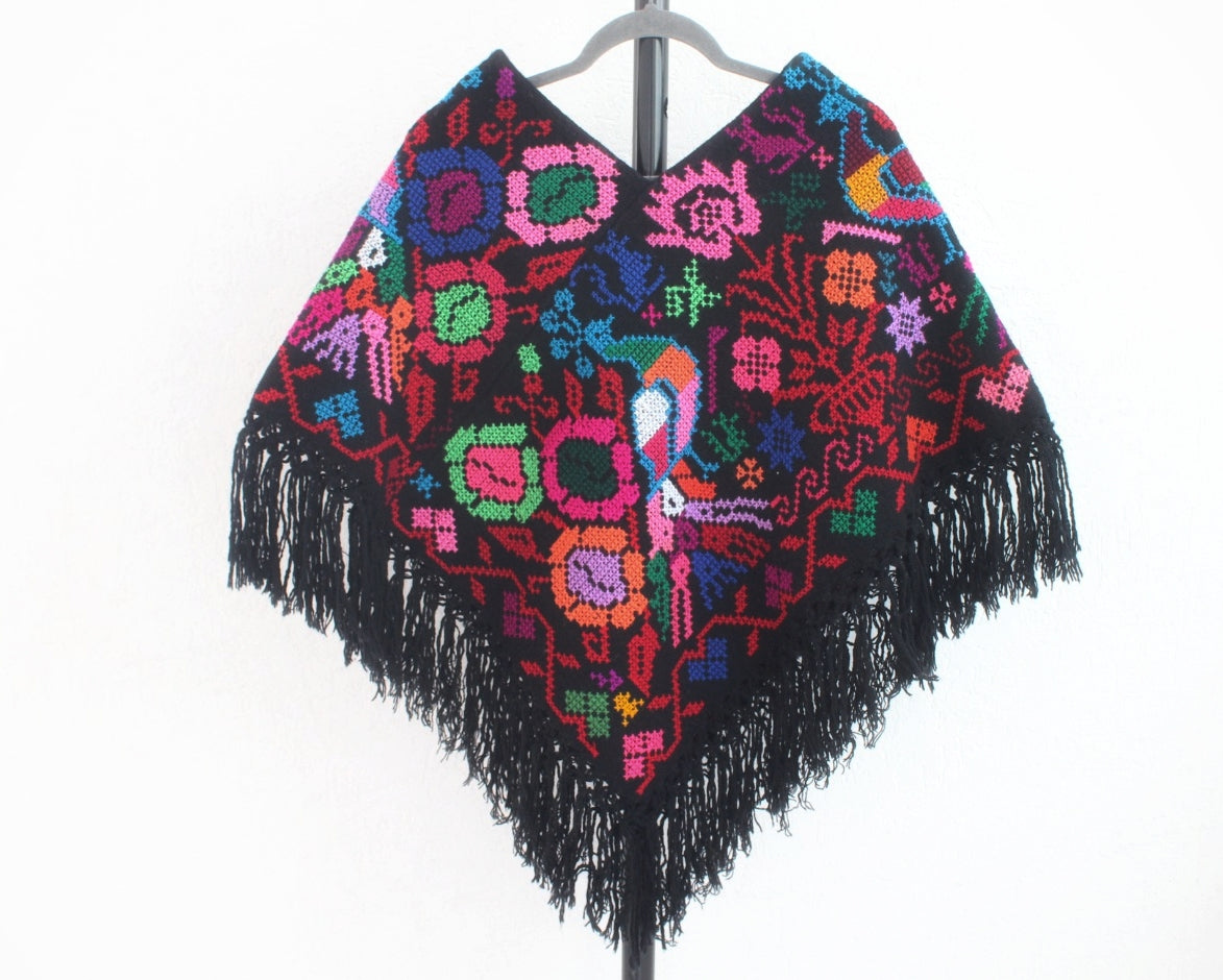 Hermoso Quexquémitl pieza bordada a mano con hermosos estambres de colores que dibujan hermosos pavorreales y flores de colores sobre un fondo negro que logran una pieza llena de magia y color