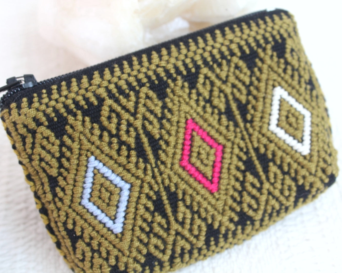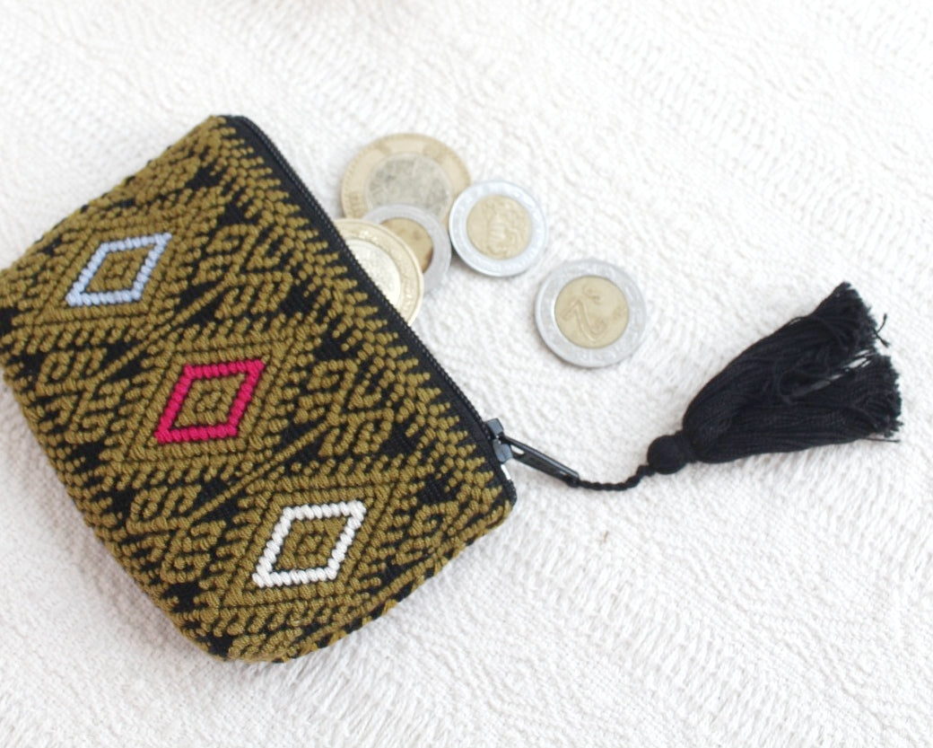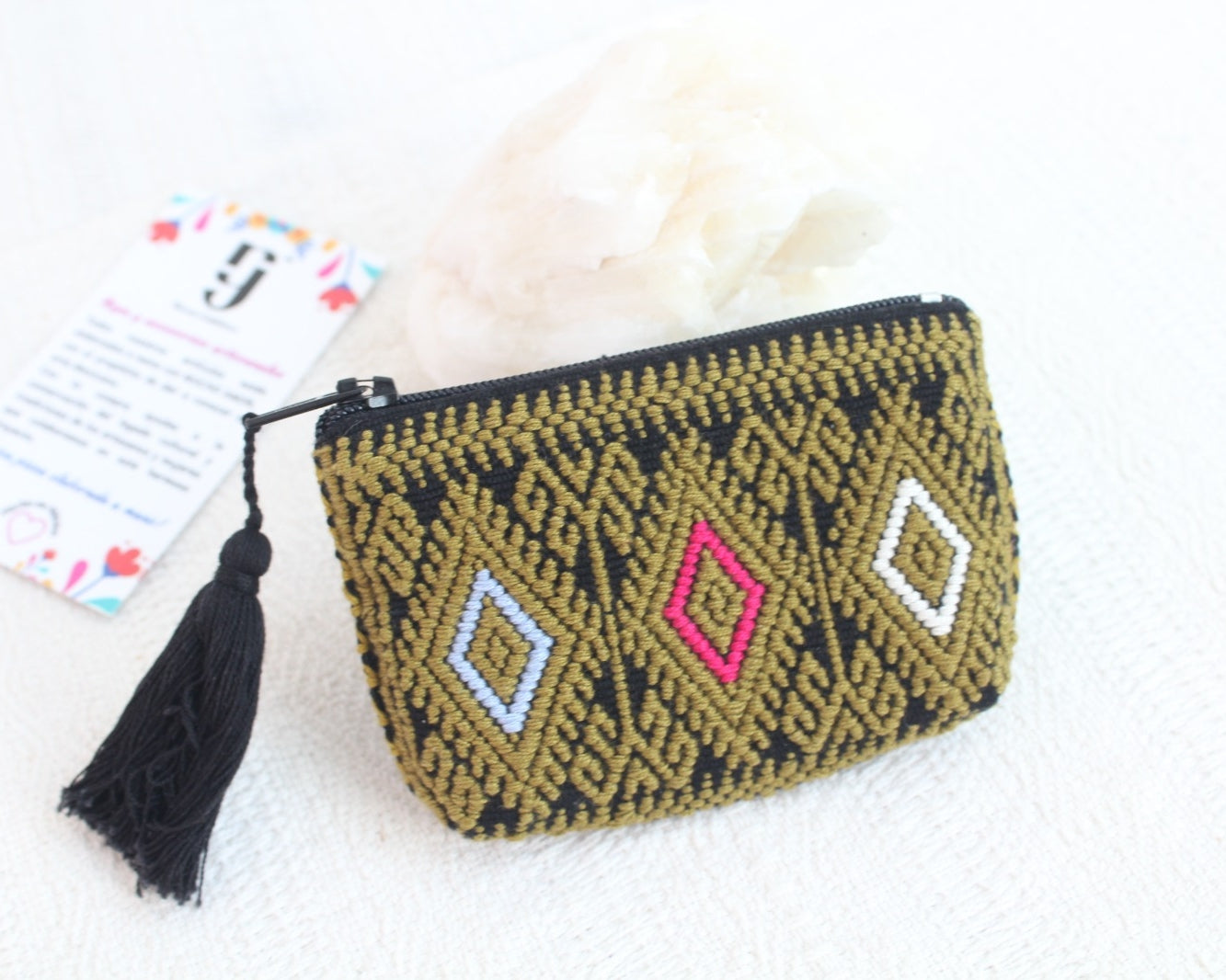 Mini Monedero elaborado a mano por artesanas mexicanas en telar de cintura con hilos de algodón con los que forman hermosos brocados que reflejan hermosas estrellas con hermos detalles color verde sobre un fondo color negro.
