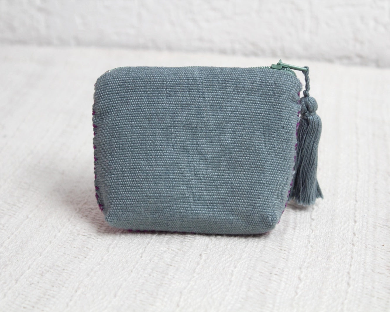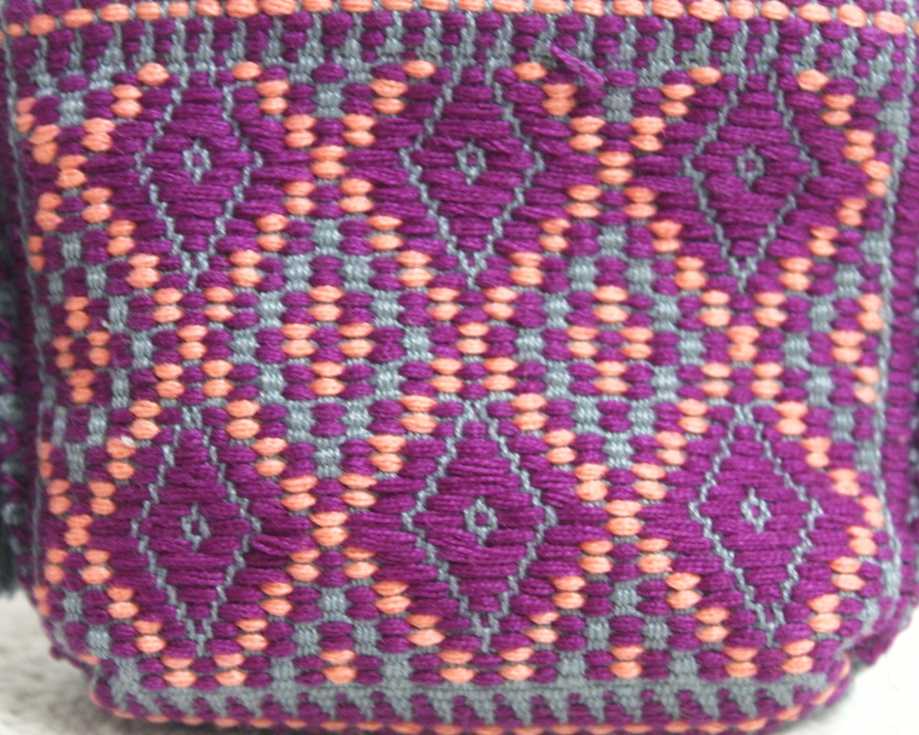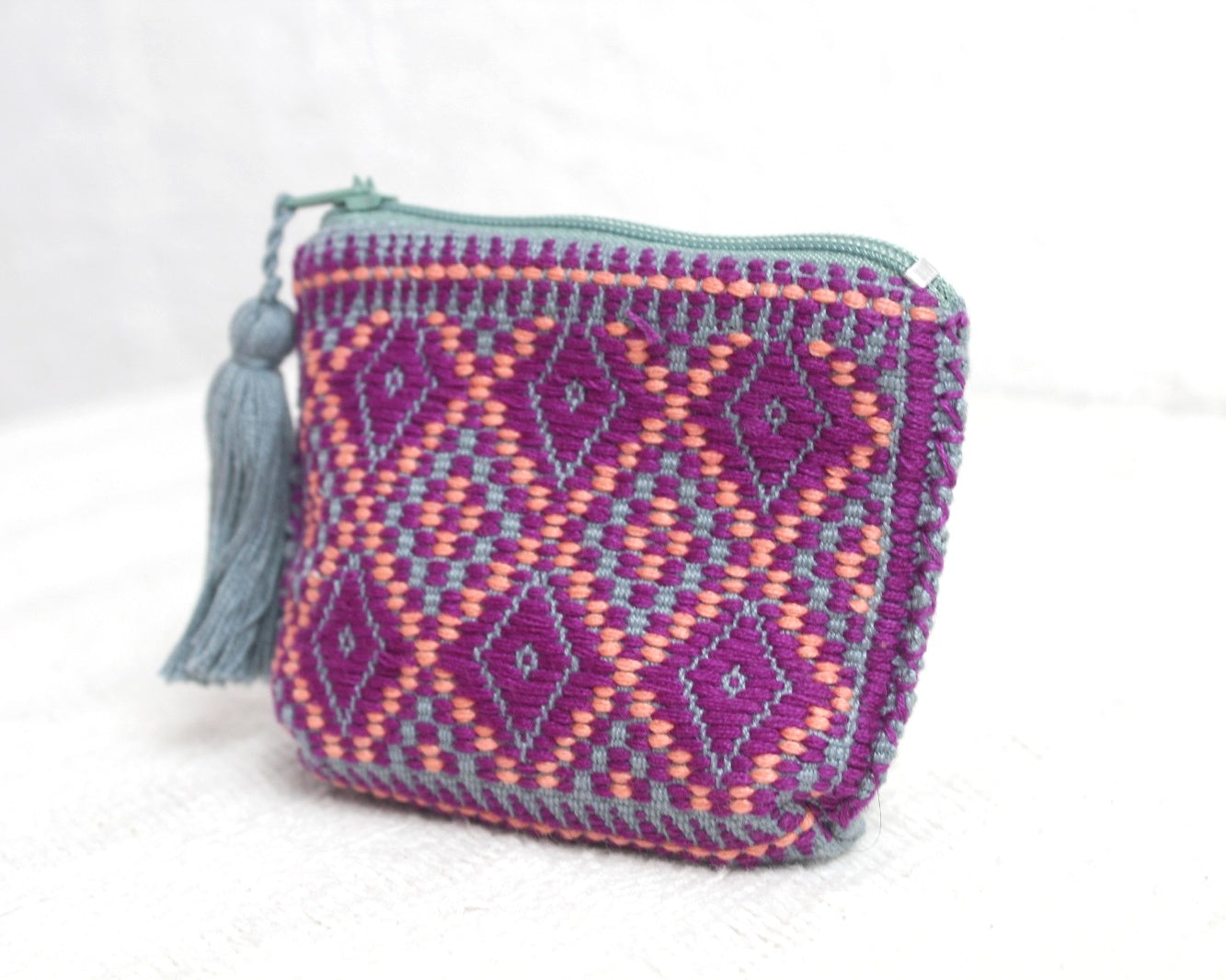 Mini Monedero elaborado a mano por artesanas mexicanas en telar de cintura con hilos de algodón con los que forman hermoso brocado representa "Cabeza de Nuestro Padre el Señor", el significado: El Sol es personificado como Nuestro Padre el Señor Jesucristo, en el imaginario de las tejedoras