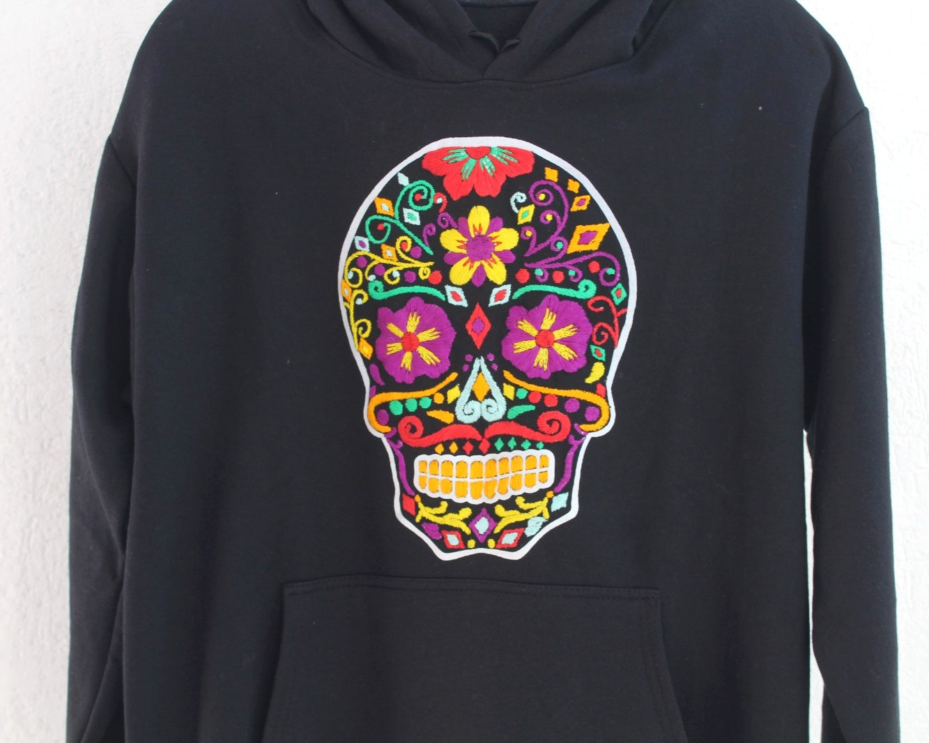 Con mucho gusto le presentamos una hermosa sudadera en negro y hermoso bordado hechos a mano con hilos de colores que dibujan una calavera y aporta un toque de especial muy mexicano .