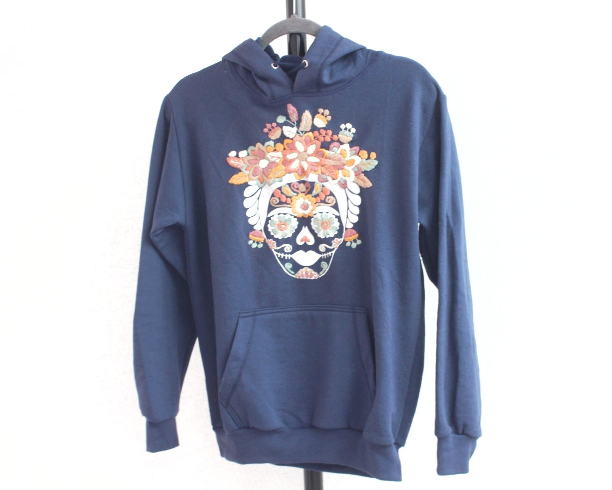 Con mucho gusto le presentamos una hermosa sudadera en color Azul Marino y hermoso bordado hechos a mano con hilos de colores que dibujan una Catrina y aporta un toque de especial muy mexicano .