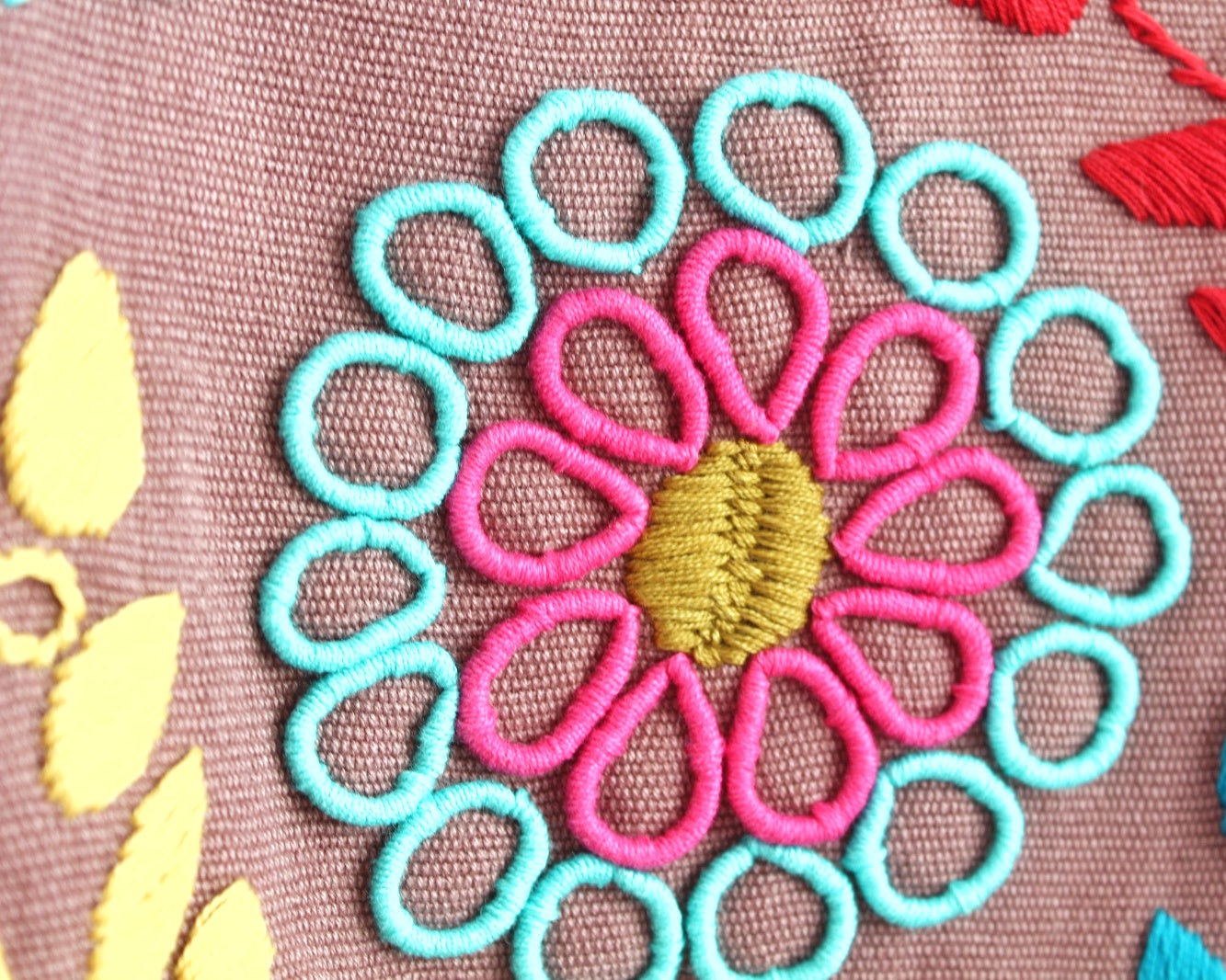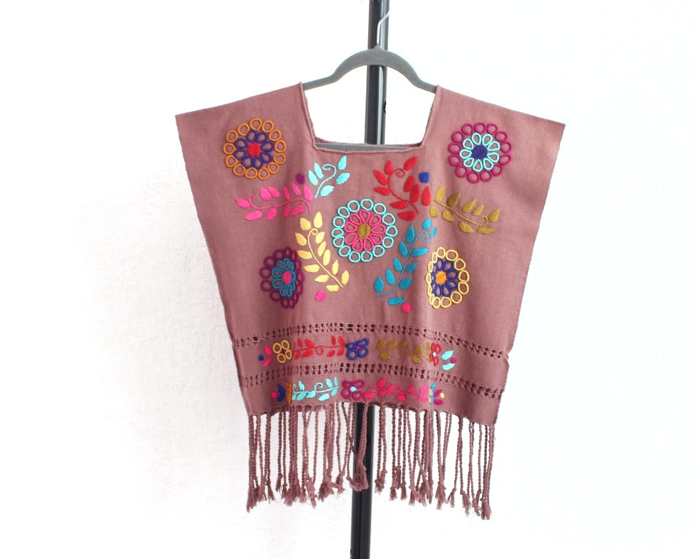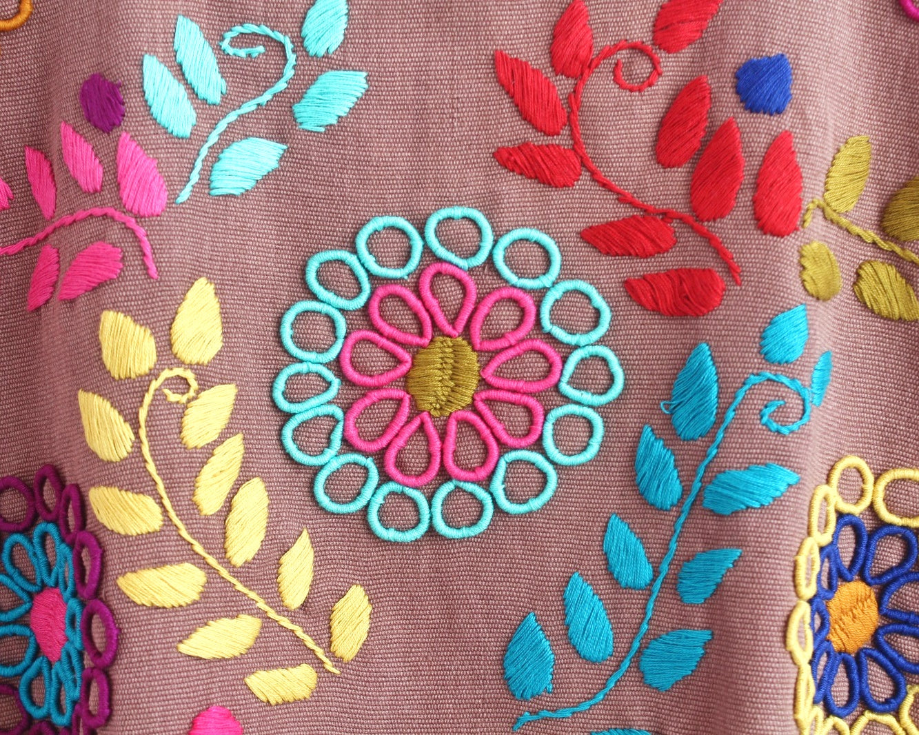 Hermoso detalle con lindas flores y hojas de colores que destacan sobre un lienzo color palo de rosa que hacen una blusa única muy linda