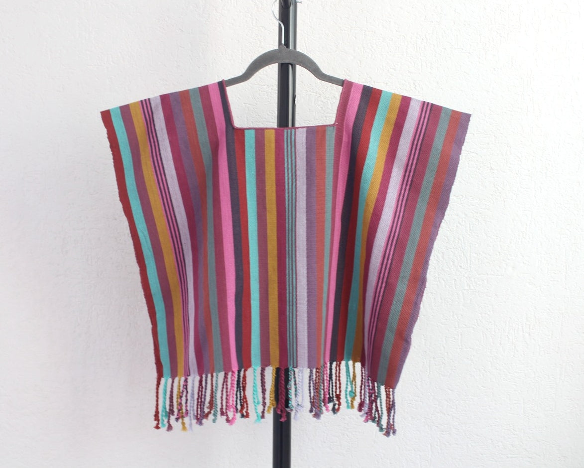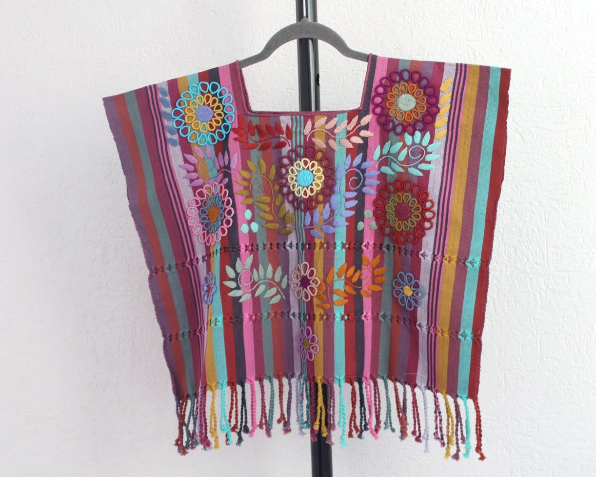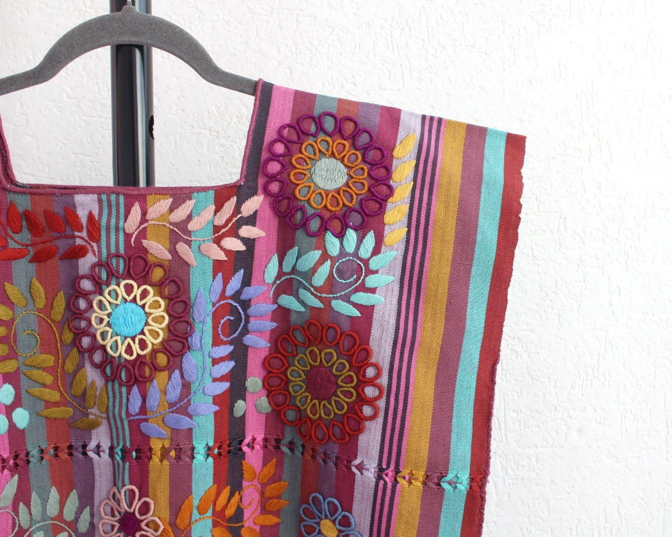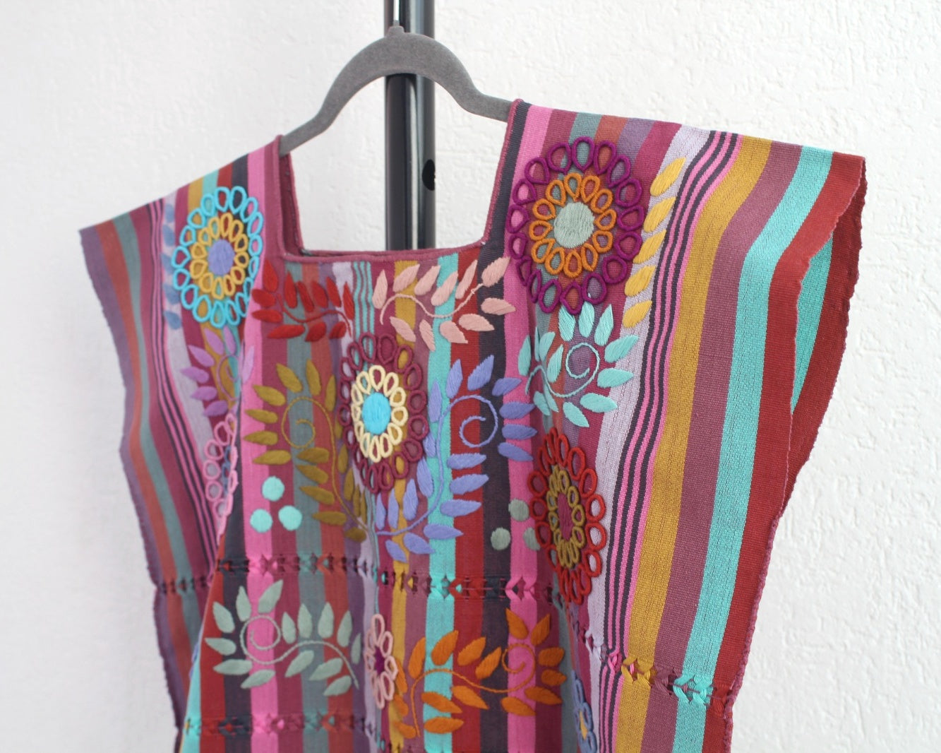 Hermoso detalle con lindas flores y hojas que destacan sobre un lienzo con líneas verticales de colores rosa, lila, menta, negro, amarillo turquesa y violeta que hacen una blusa única muy linda