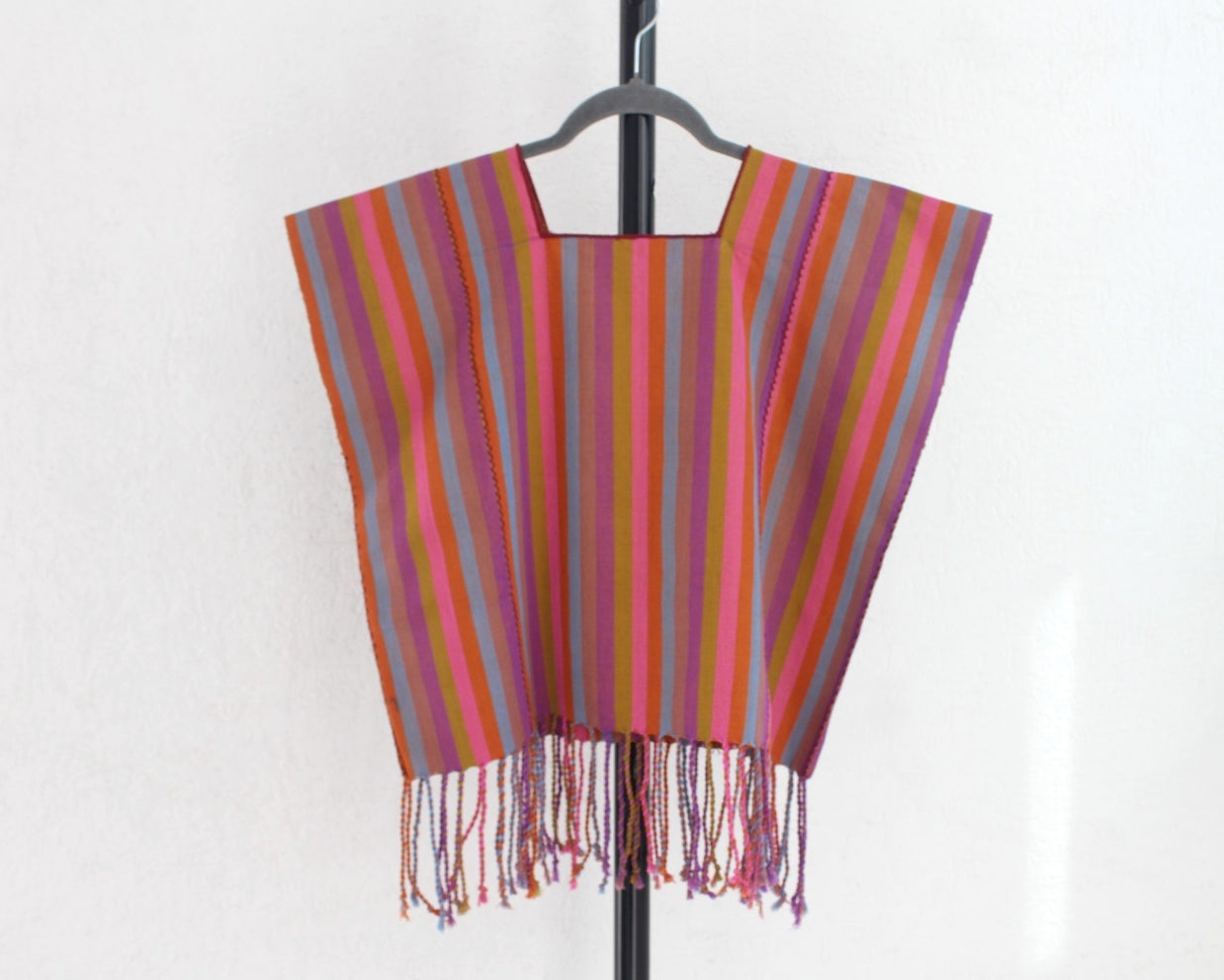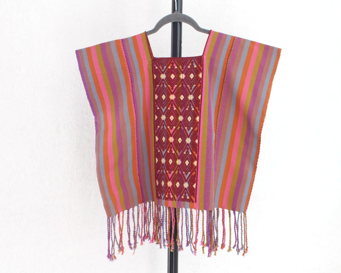 Blusa elaborada a mano en telar de cintura con hilos de algodón, hermoso brocado al frente de estrellas en color vino sombre un lienzocon lineas verticales de colores .