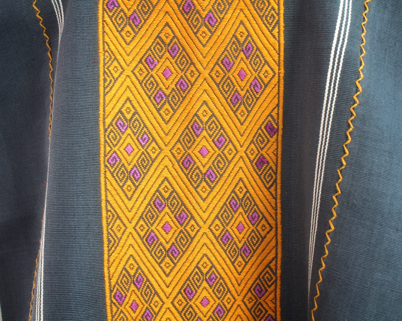 Blusa elaborada a mano en telar de cintura con hilos de algodón, hermoso brocado al frente de estrellas en color mostaza y lia un fondo color gris y lineas blancas.