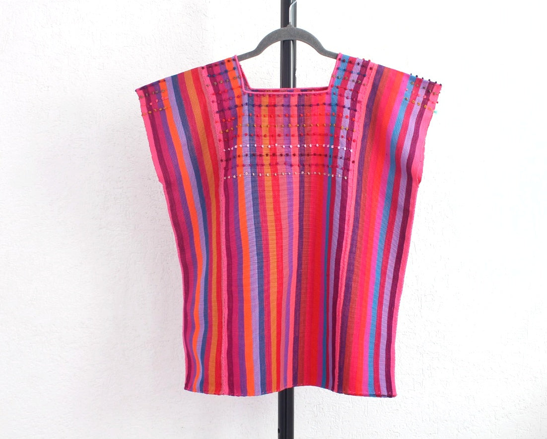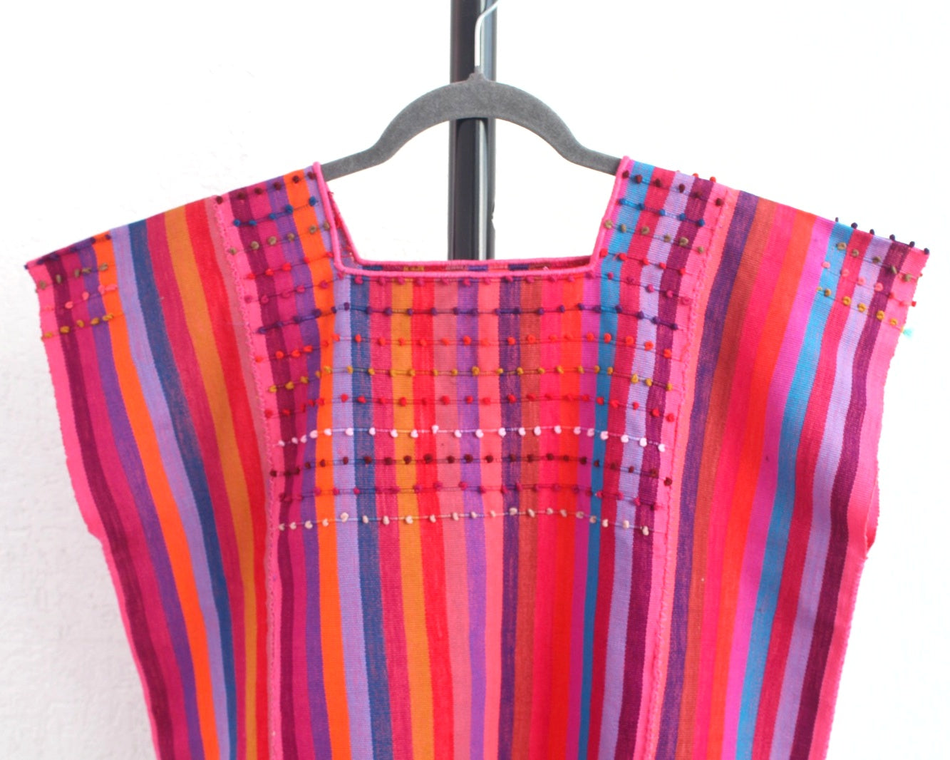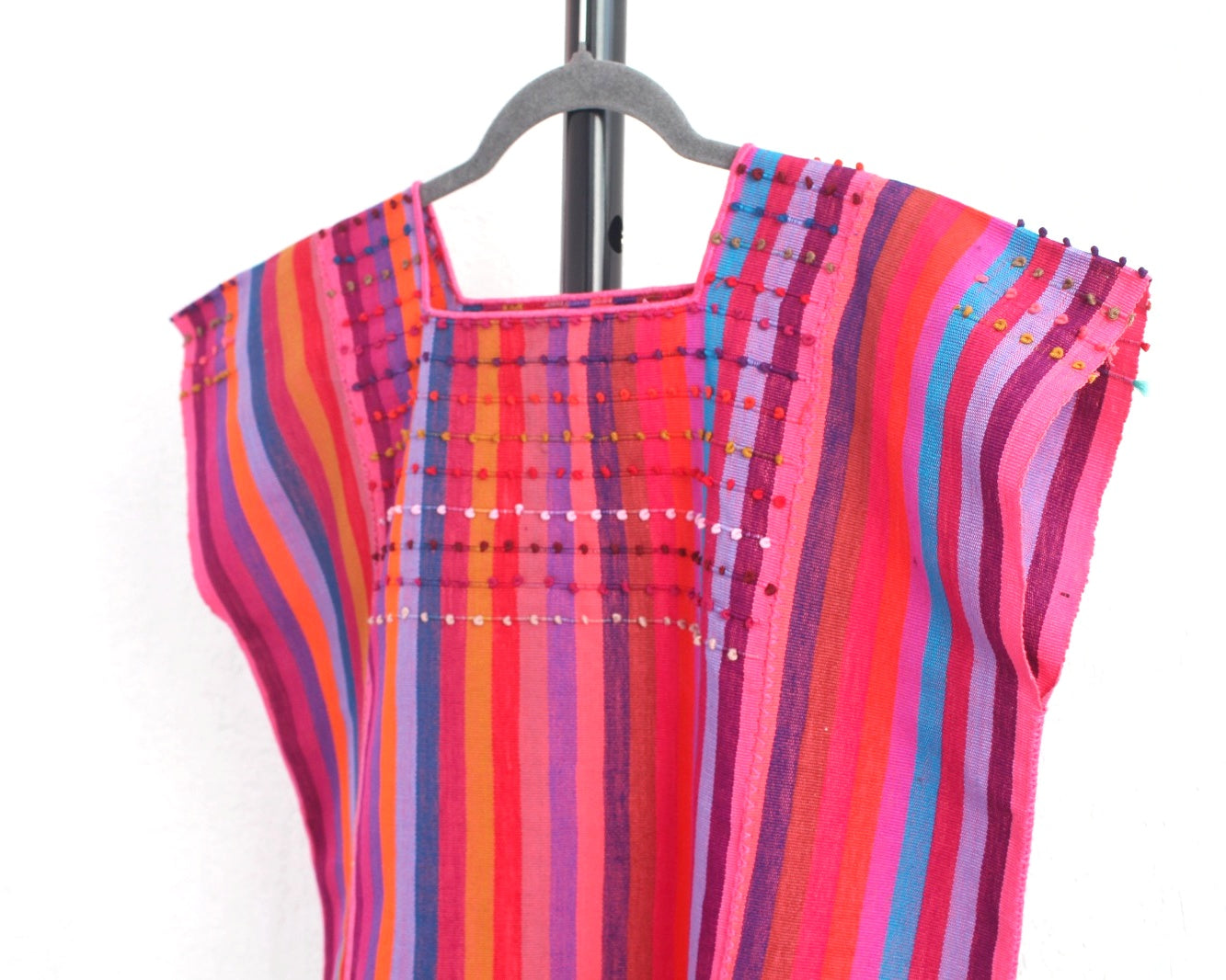 Hermoso detalle al frente de nuditos con hilos de colores, la blusa está diseñada con líneas verticales de colores rosa mexicano, lila, naranja, morado, azul,, risa claro y coral hacen una blusa única.