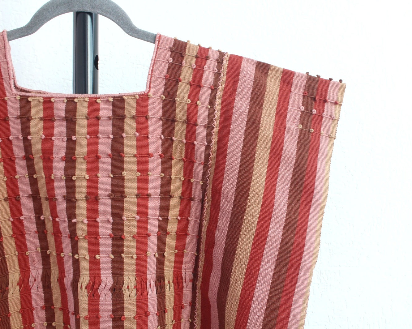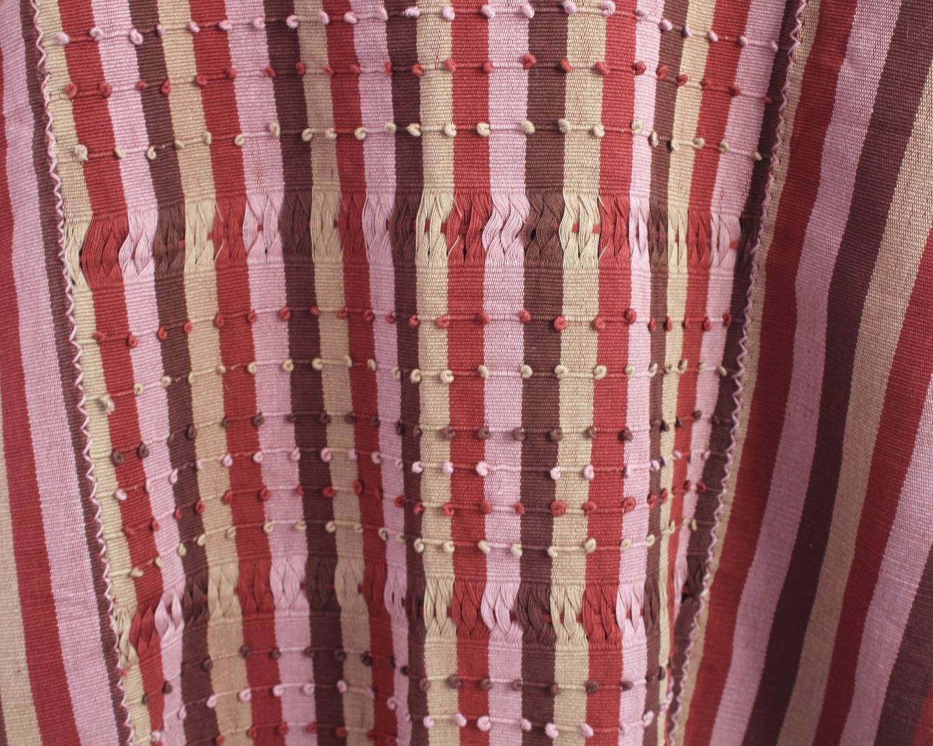 Hermoso detalle al frente de nuditos con hilos de colores la blusa está diseñada con líneas verticales de colores café, naranja, rosa y beige hacen una blusa única llena de colores.