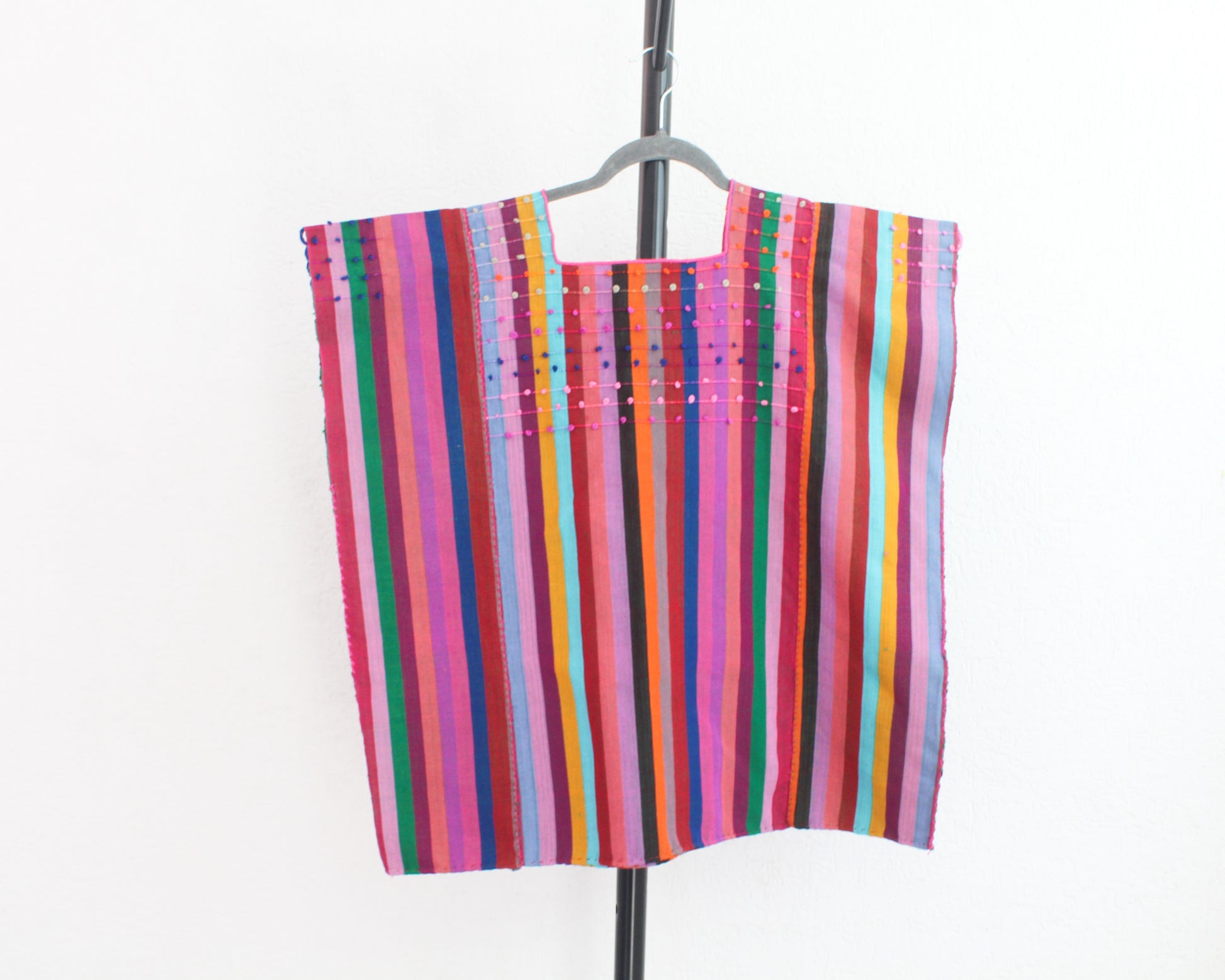 Hermoso detalle al frente de nuditos con hilos de colores la blusa está diseñada con líneas verticales de colores rosa mexicano, rosa, lila, morado, naranja, azul rey, rojo, azul claro, vino, coral, amarillo y verde hacen una blusa única llena de colores.