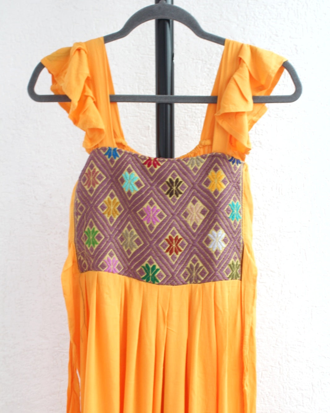 Este vestido con hermoso detalle brocado eb telar de cintura que dibujan estrellas de colores que hace una prenda muy alegre.