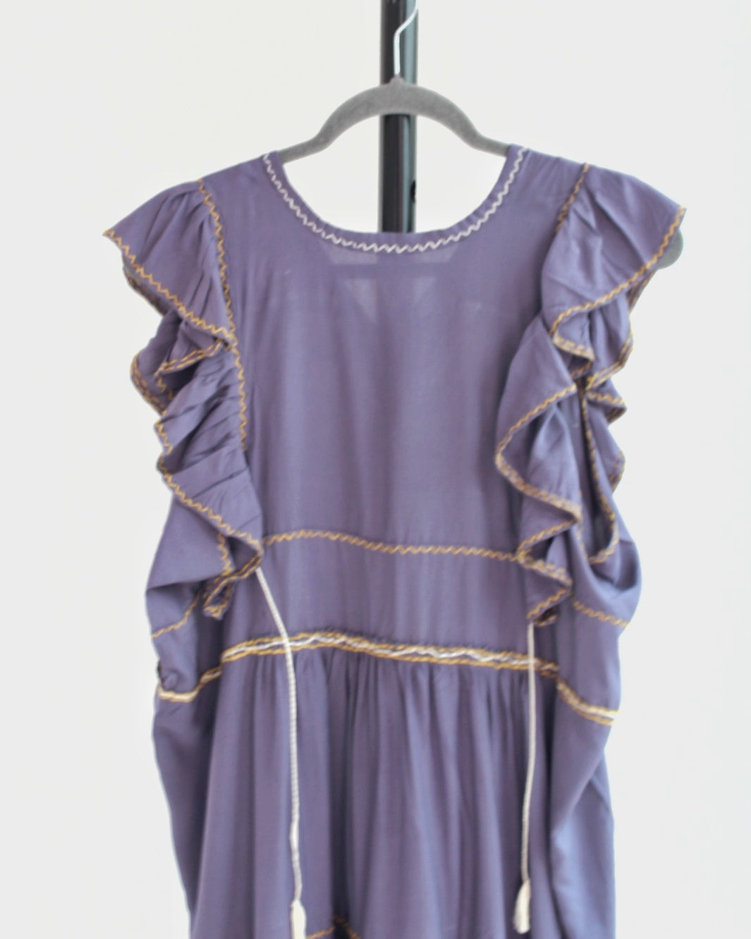Este vestido de telar con brocado es un hermoso diseño elaborado a mano en telar de cintura confeccionado con hilos de algodón, su brocado representa hermosas estrellitas de tonos color amarillo y blanco con delicados y lindos bordados a mano en técnica de rococo sobre una tela color gris oxfort.