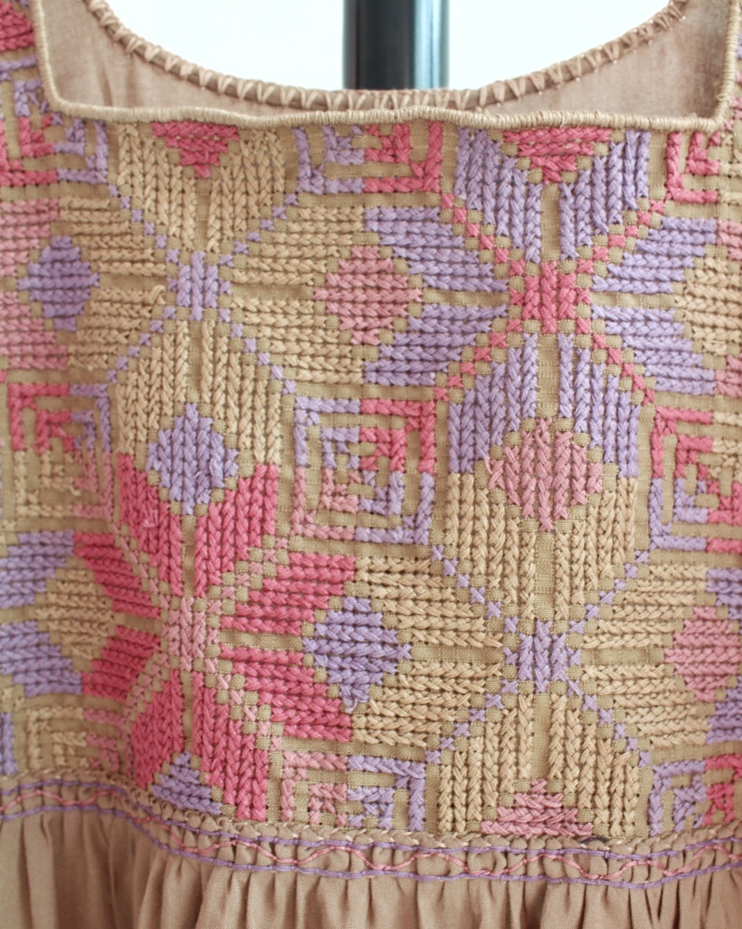 Este vestido con un hermoso diseño elaborado a mano y destacando un bordado a mano al frente lindo bordado de estrellas en técnica de punto de cruz, confeccionado con hilos de algodón sobre la tela color café claro.
